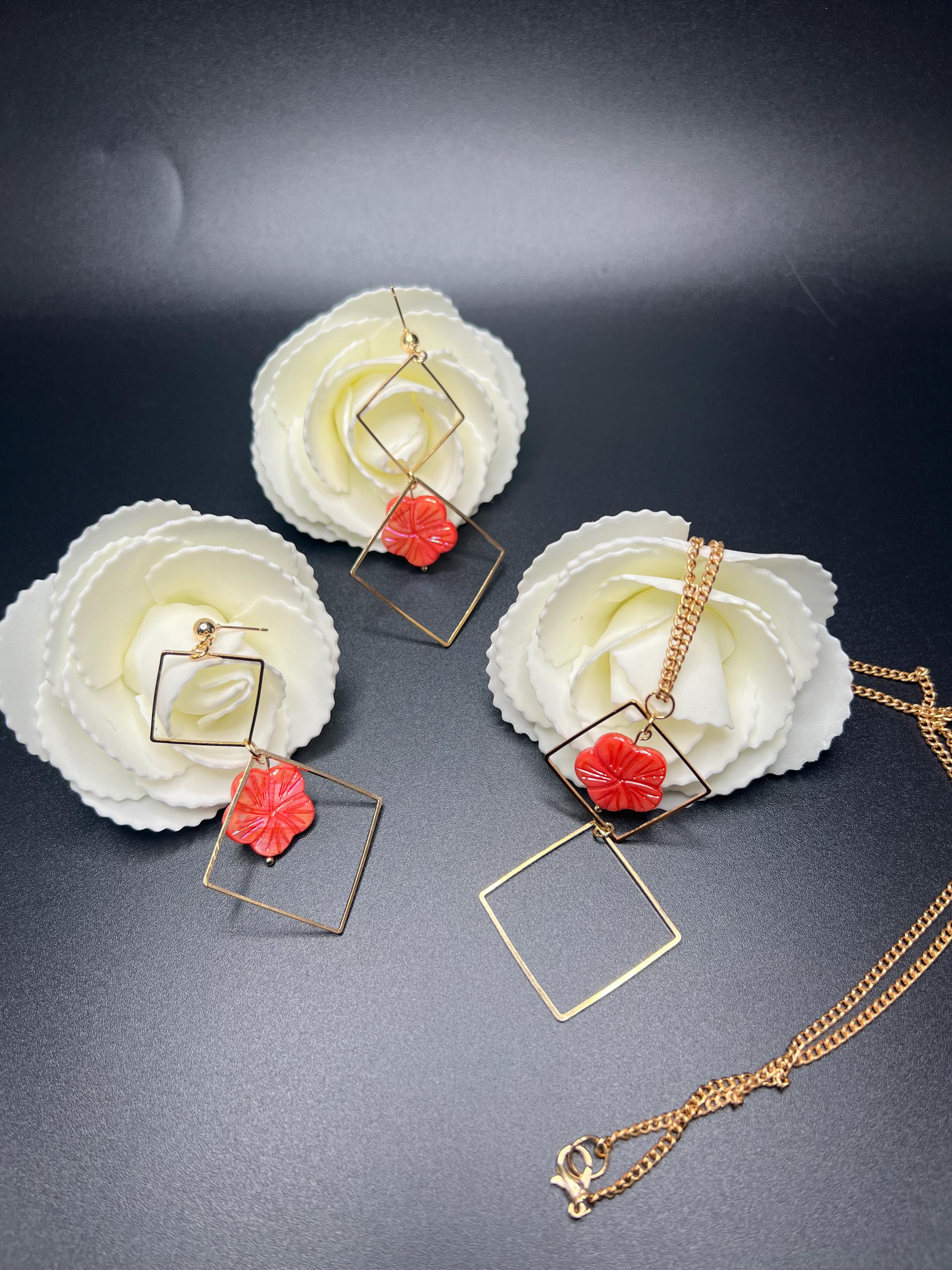 Coral Flower Pendant Necklace and Earring Set