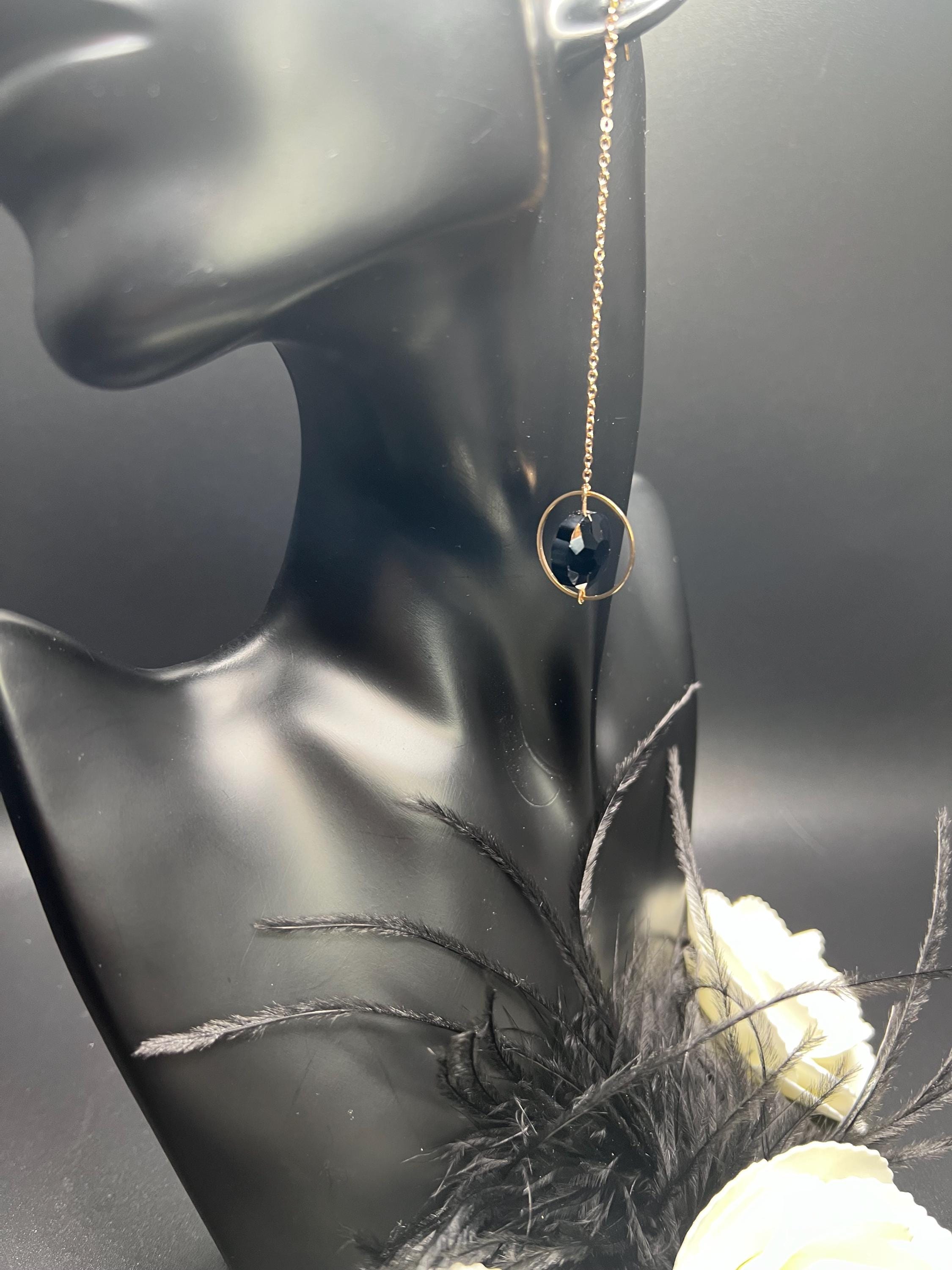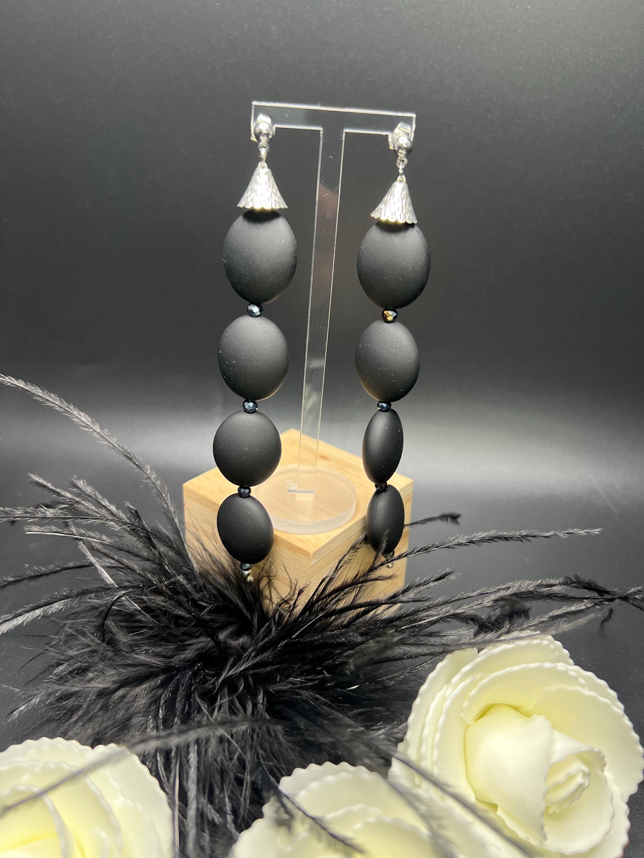 Matte Black Oval Silver Long Earrings
