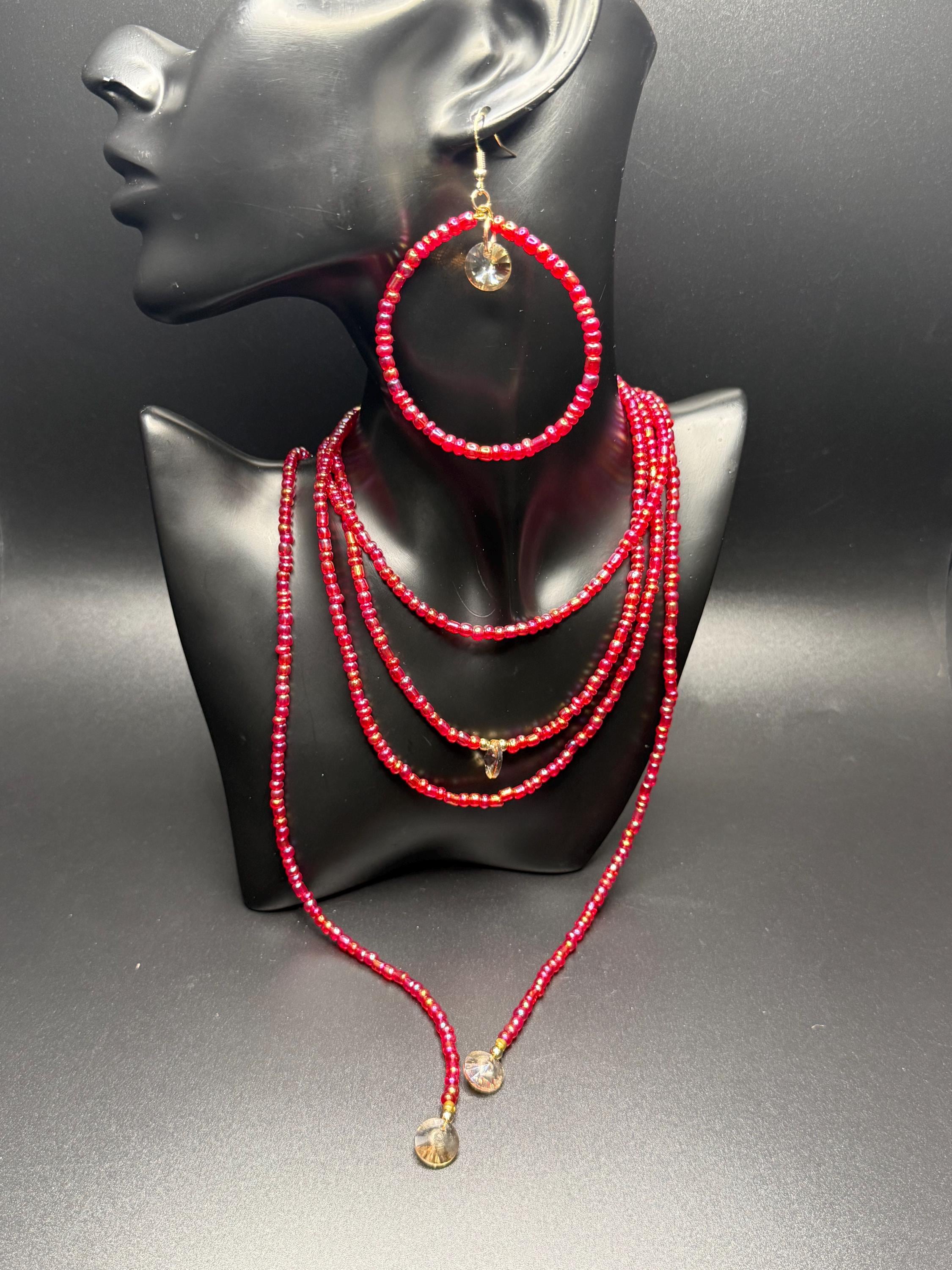 Red Iridescent Long Seed Bead Necklace Set