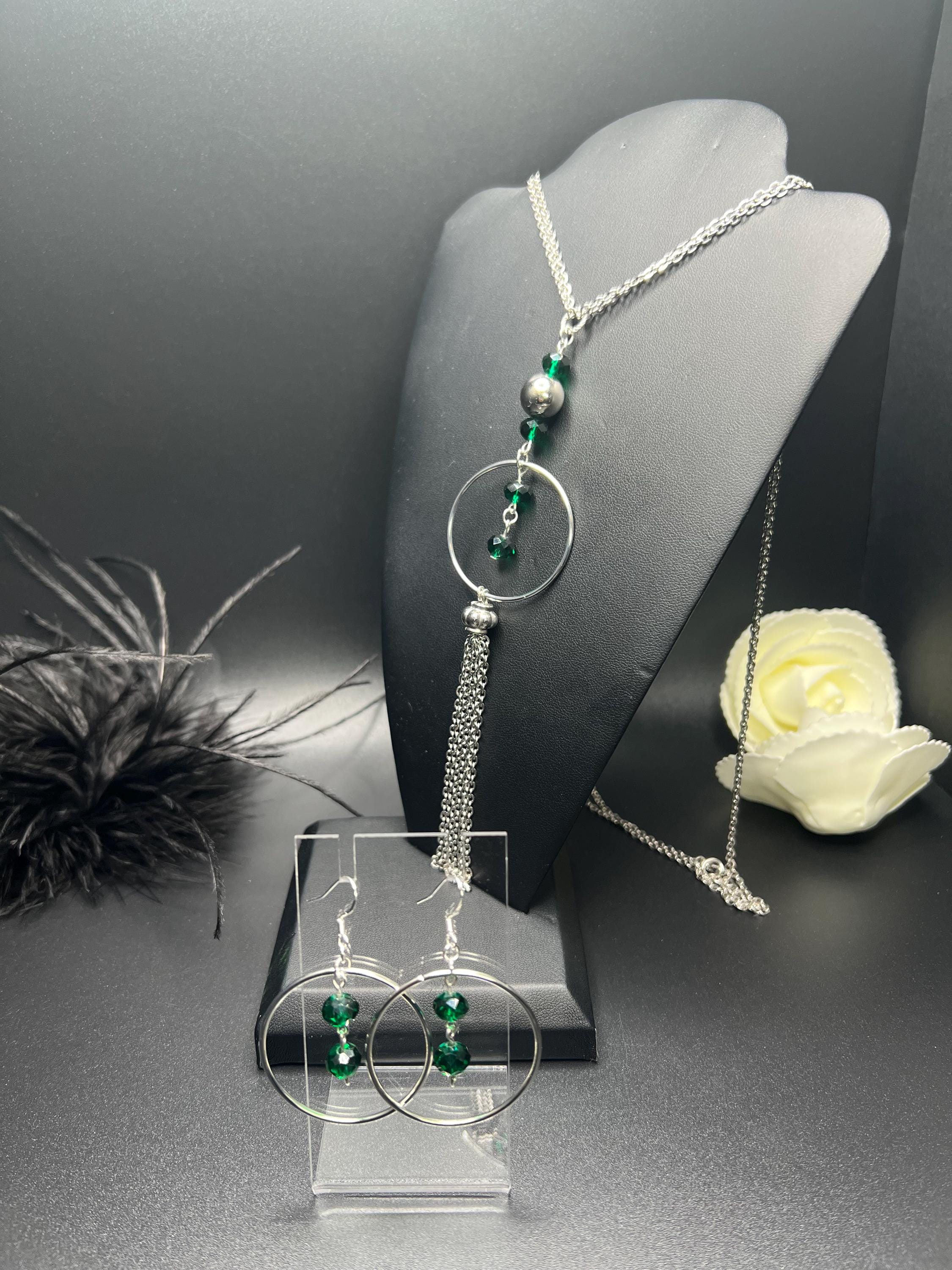 Silver Green Pendant Necklace Earring Set