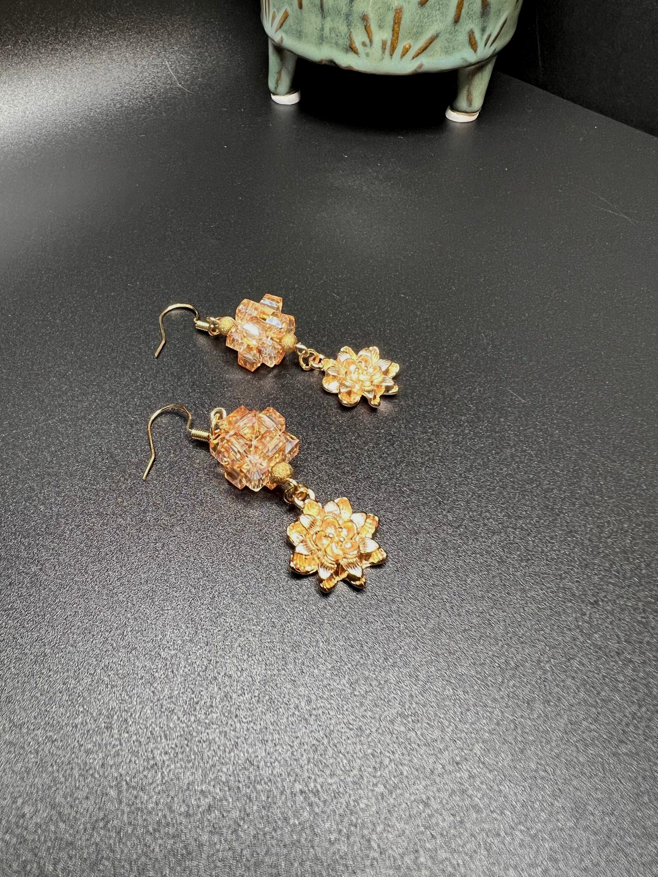 Gold Flower Charm Earrings, Crystal Earrings, Elegant Gold Earrings, Avant Garde Style, Designer Gold Jewelry