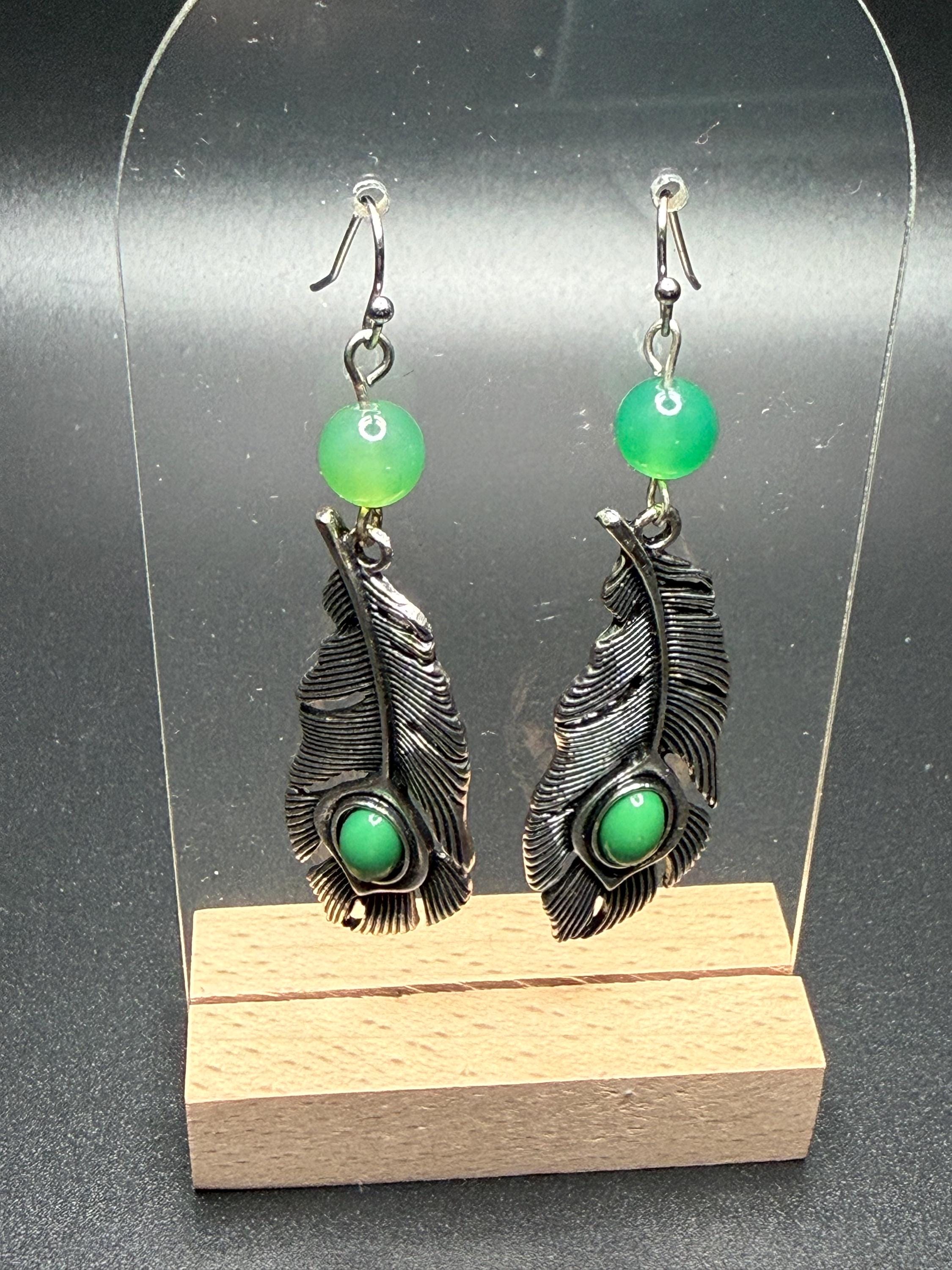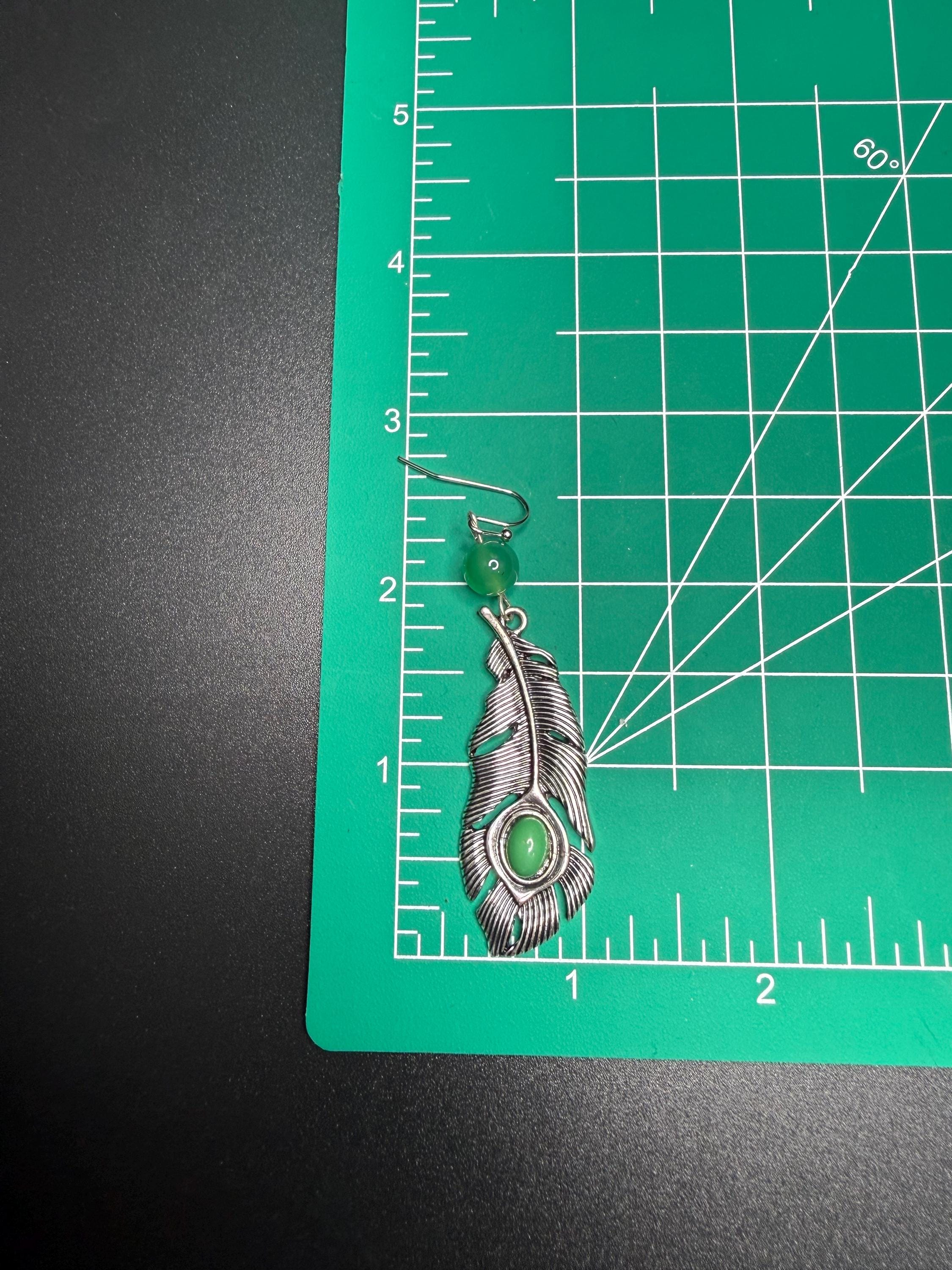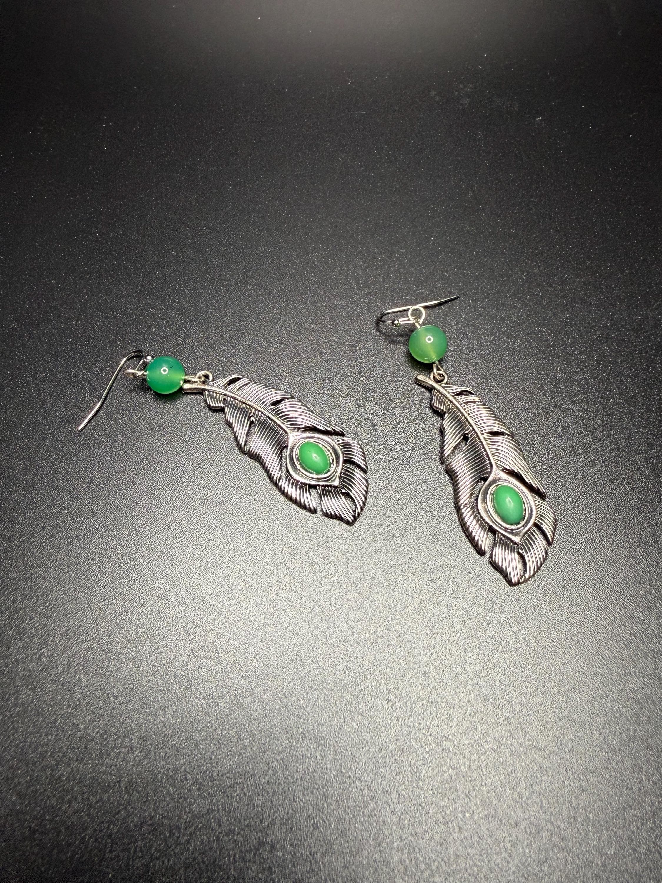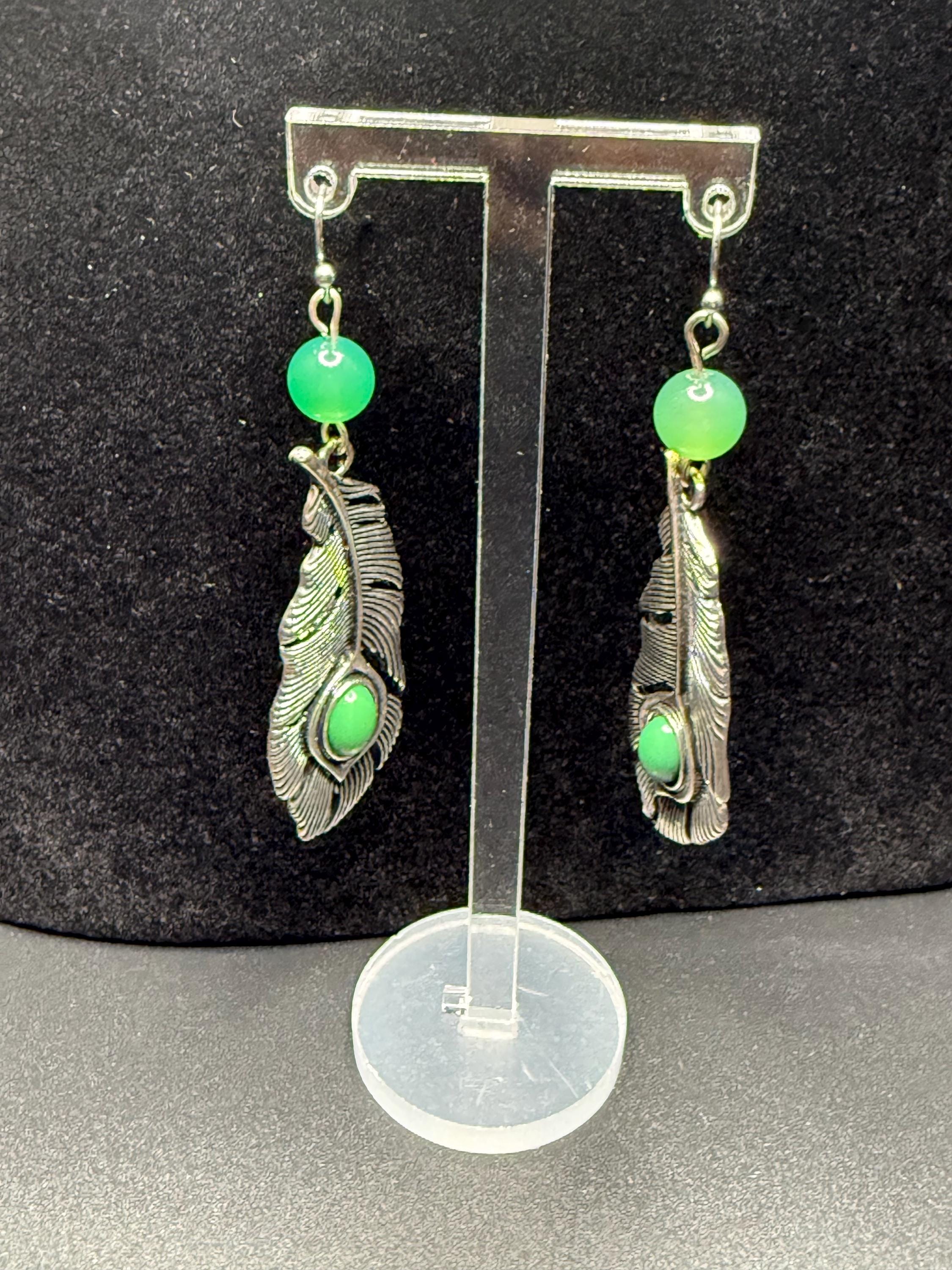 Silver and Green Beaded Leaf Earrings