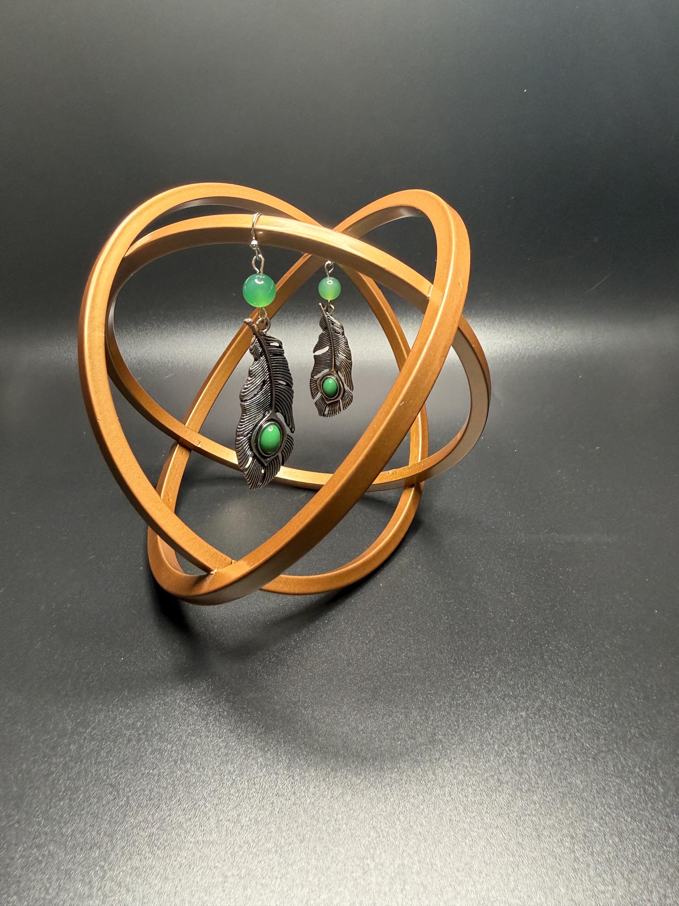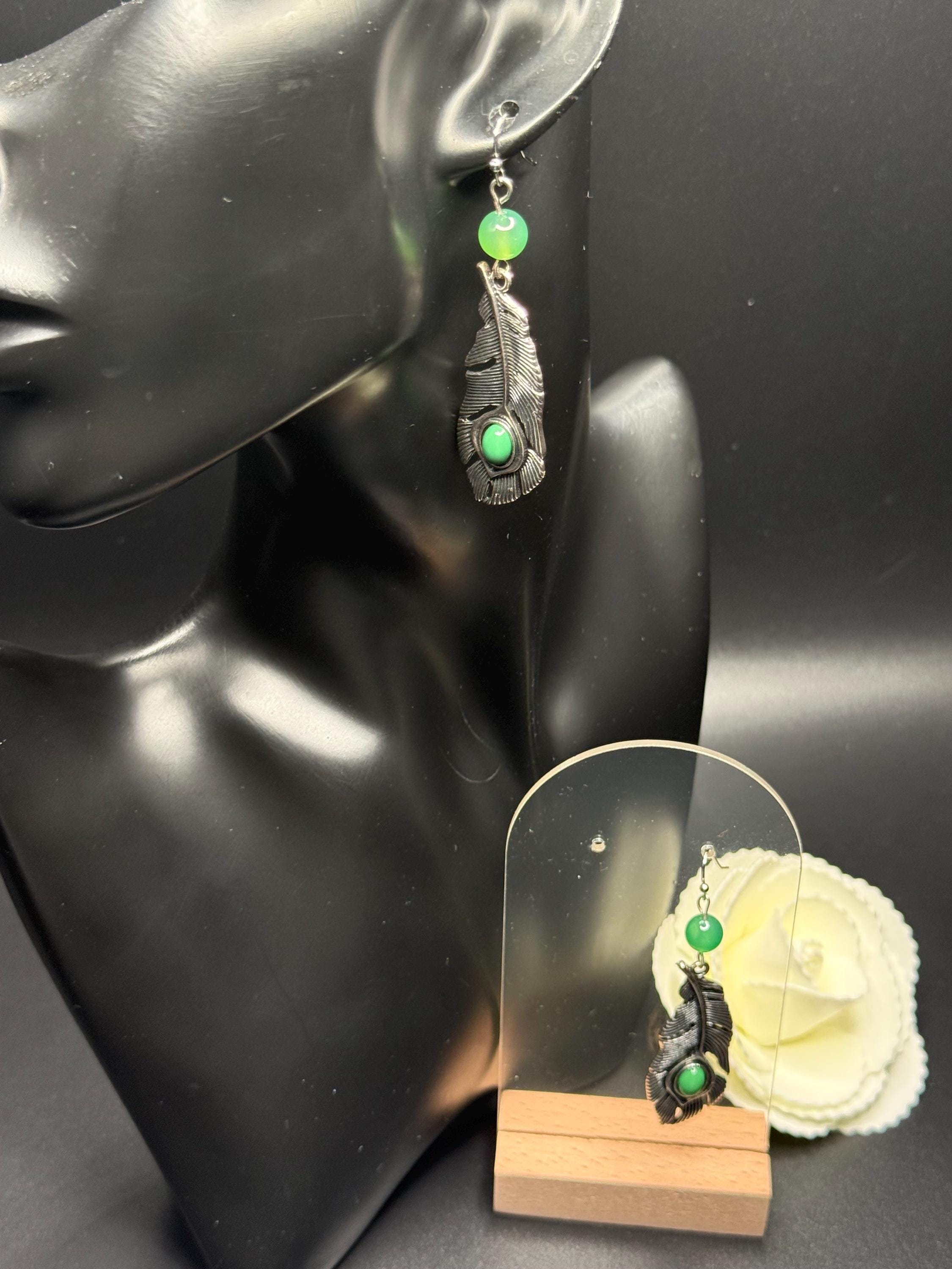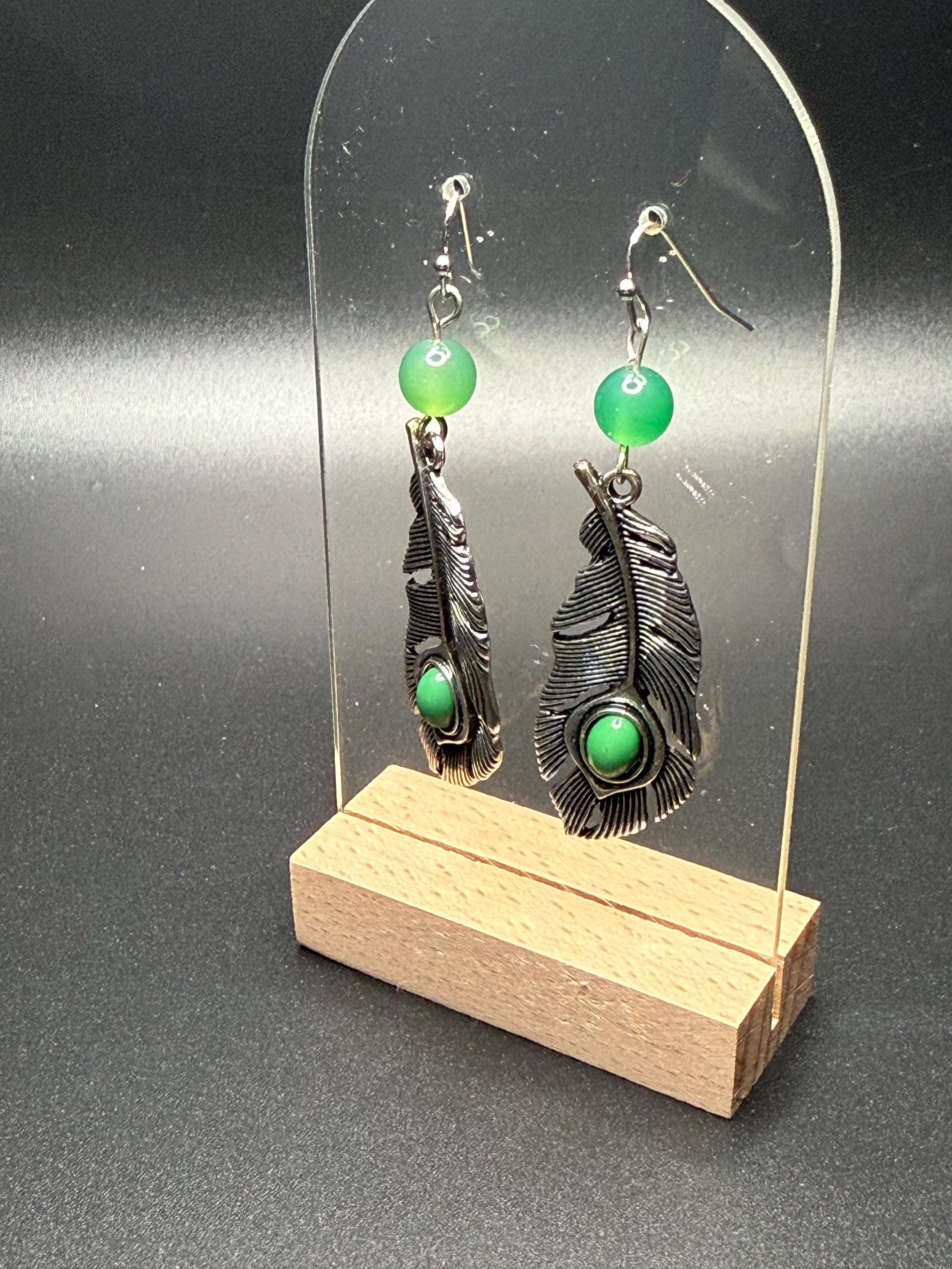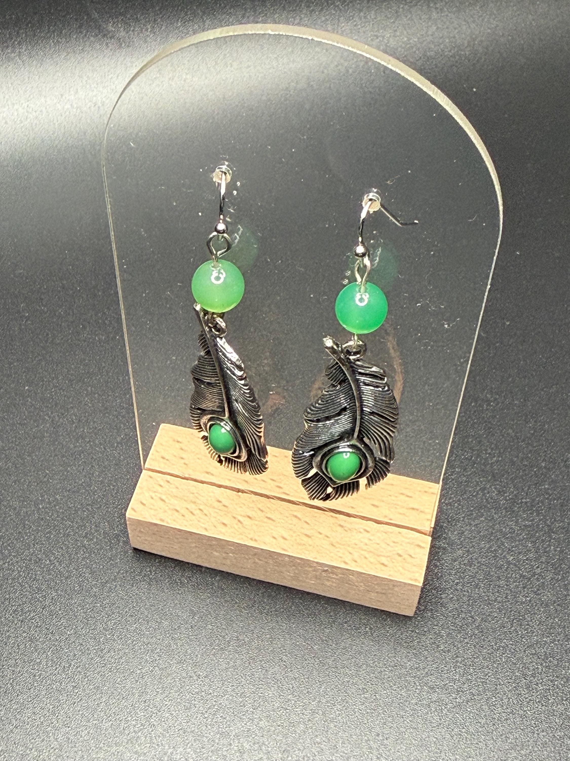 Silver and Green Beaded Leaf Earrings
