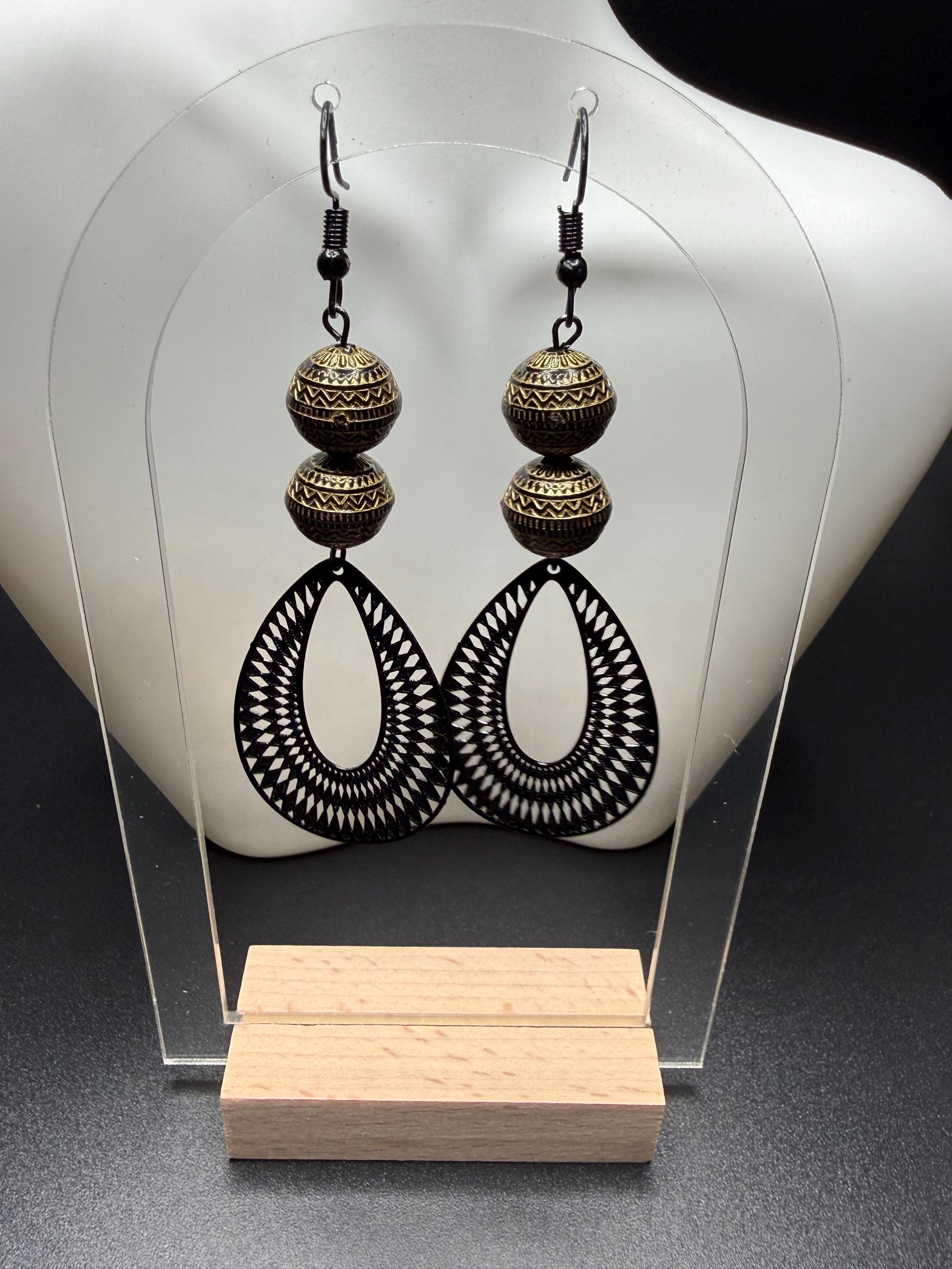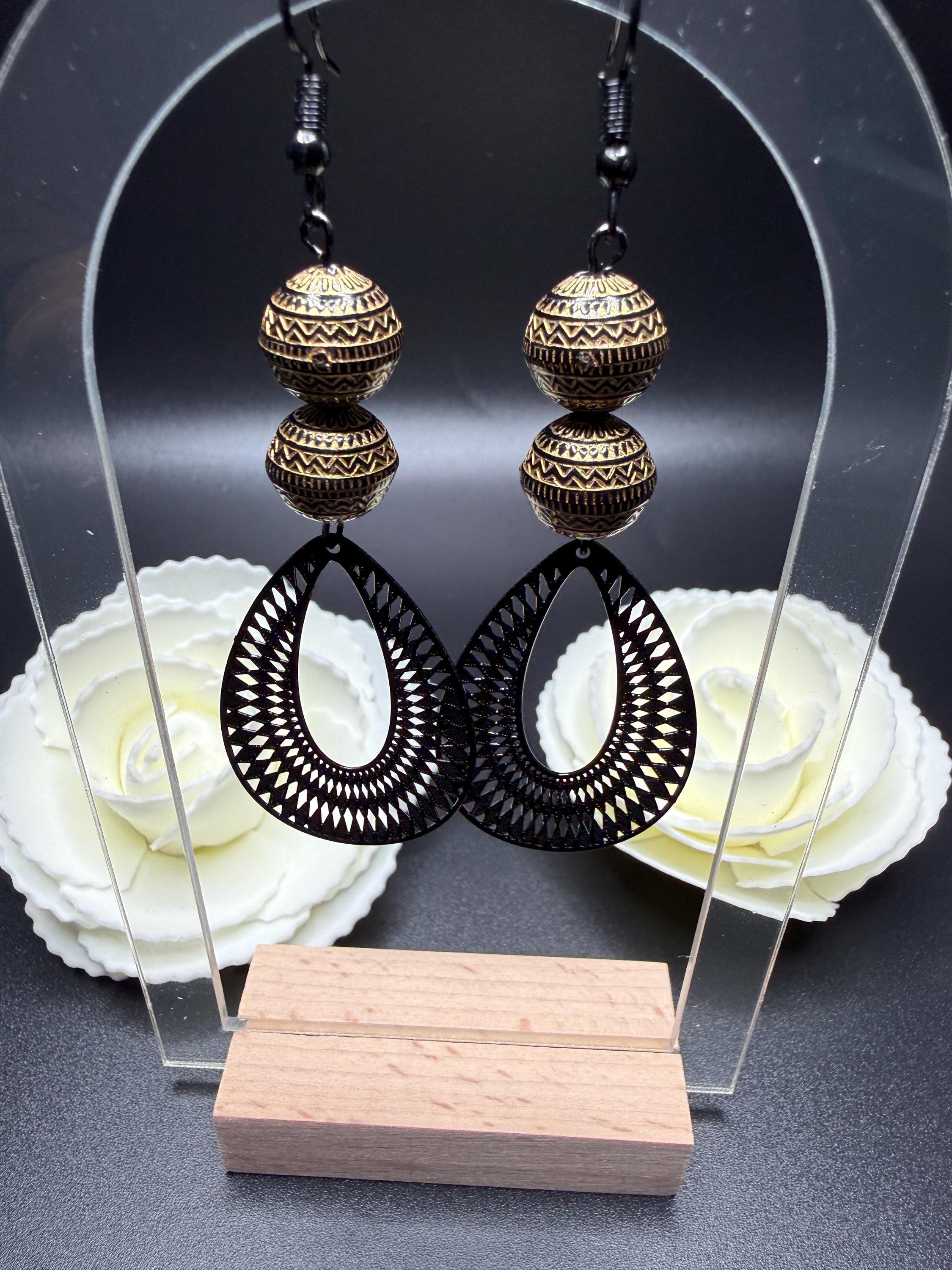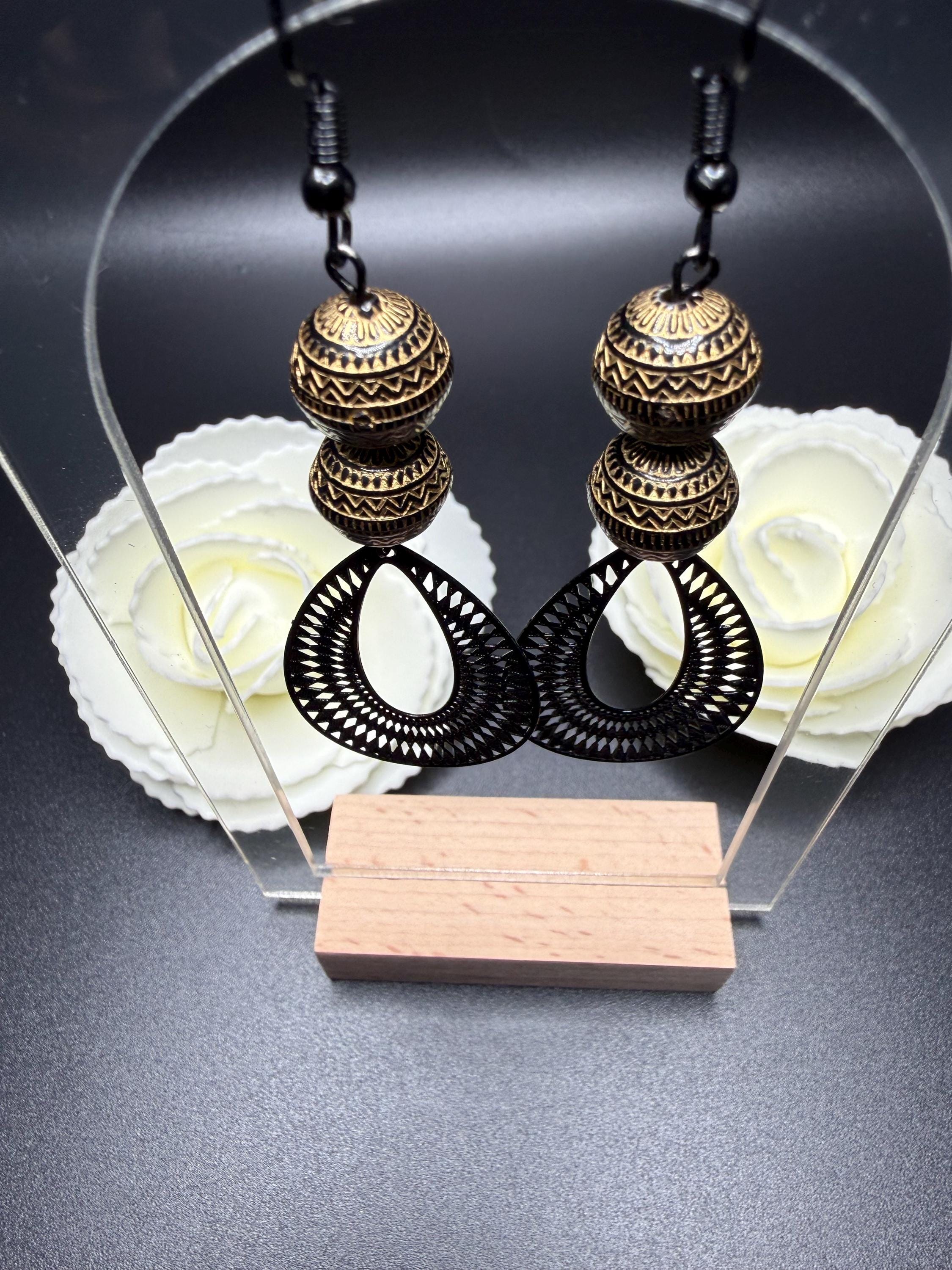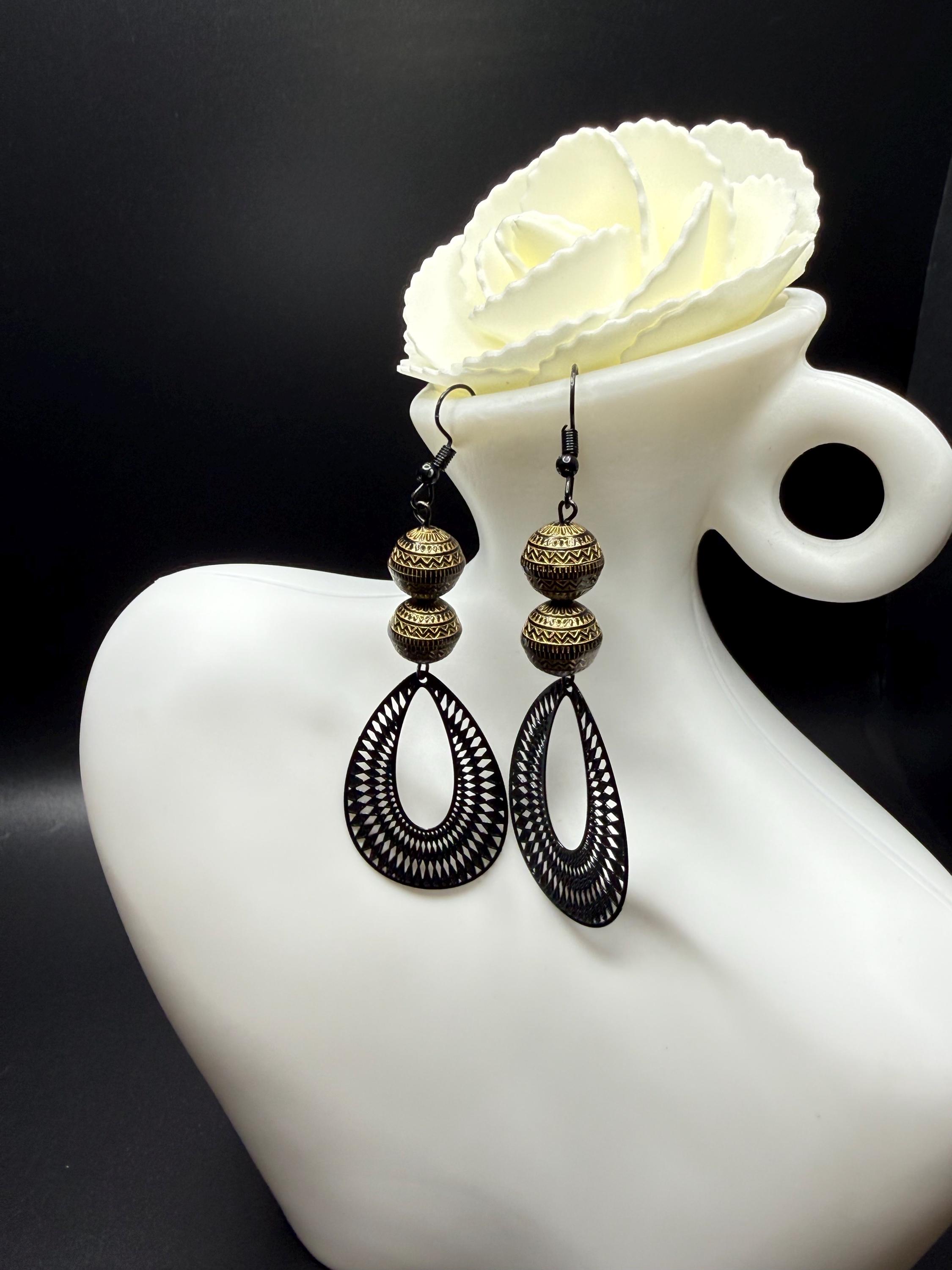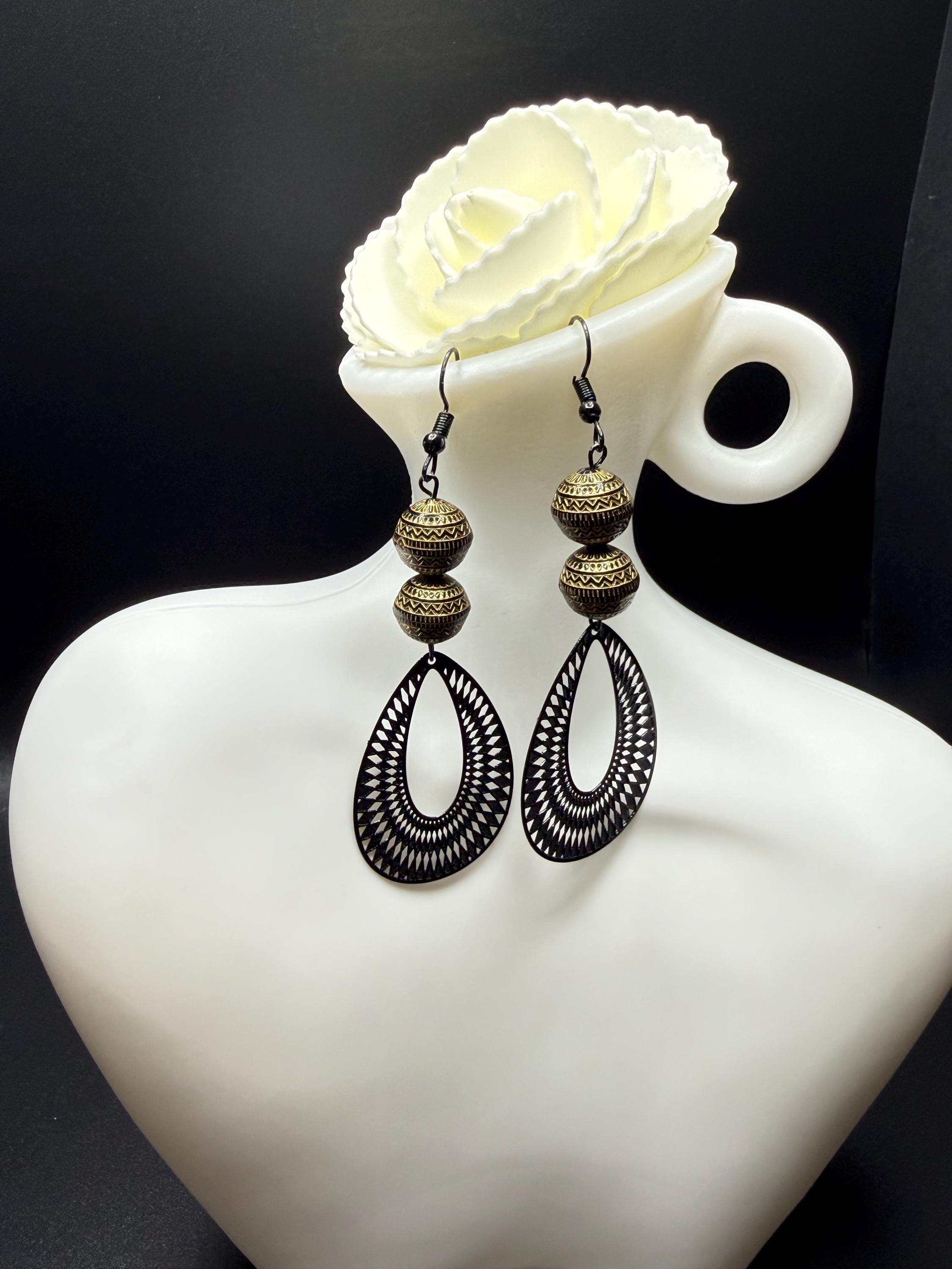 Bronze and Black Beaded Black Filagree Hoop Earrings
