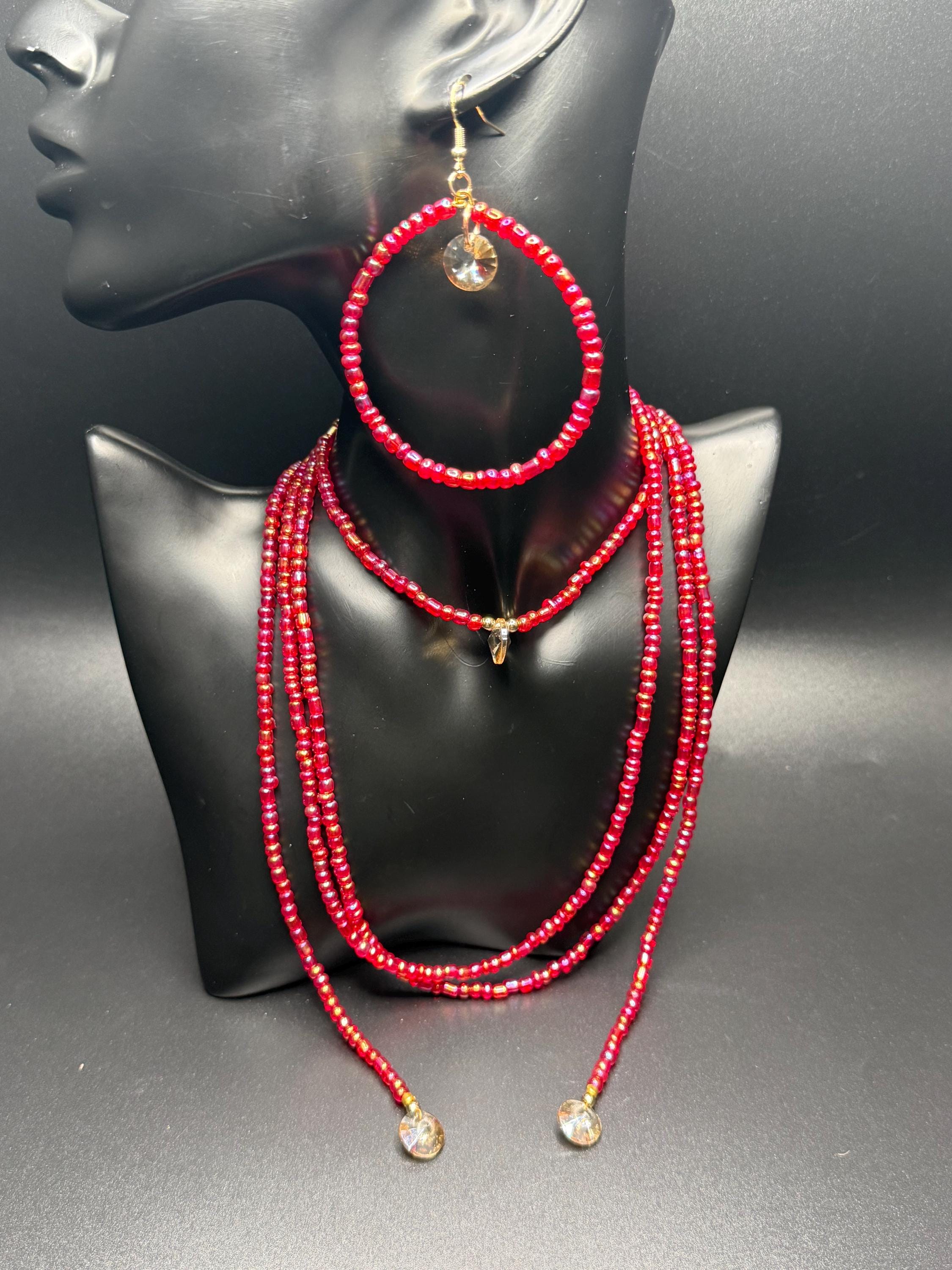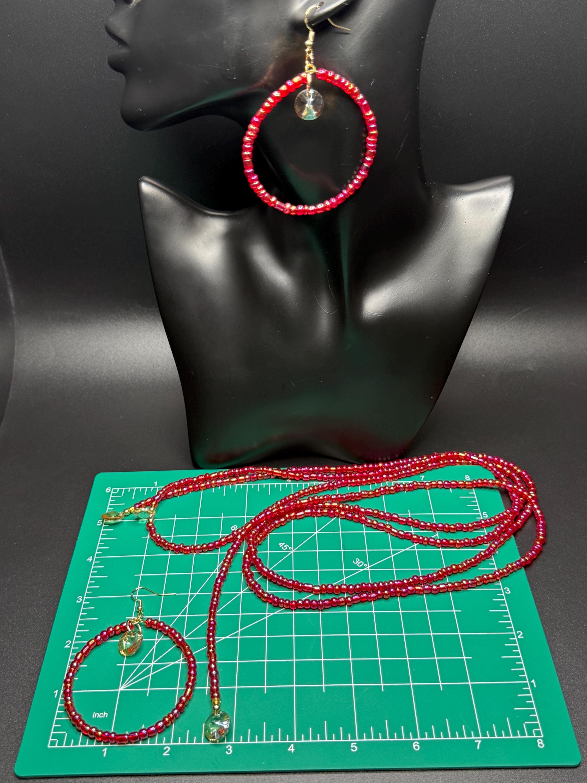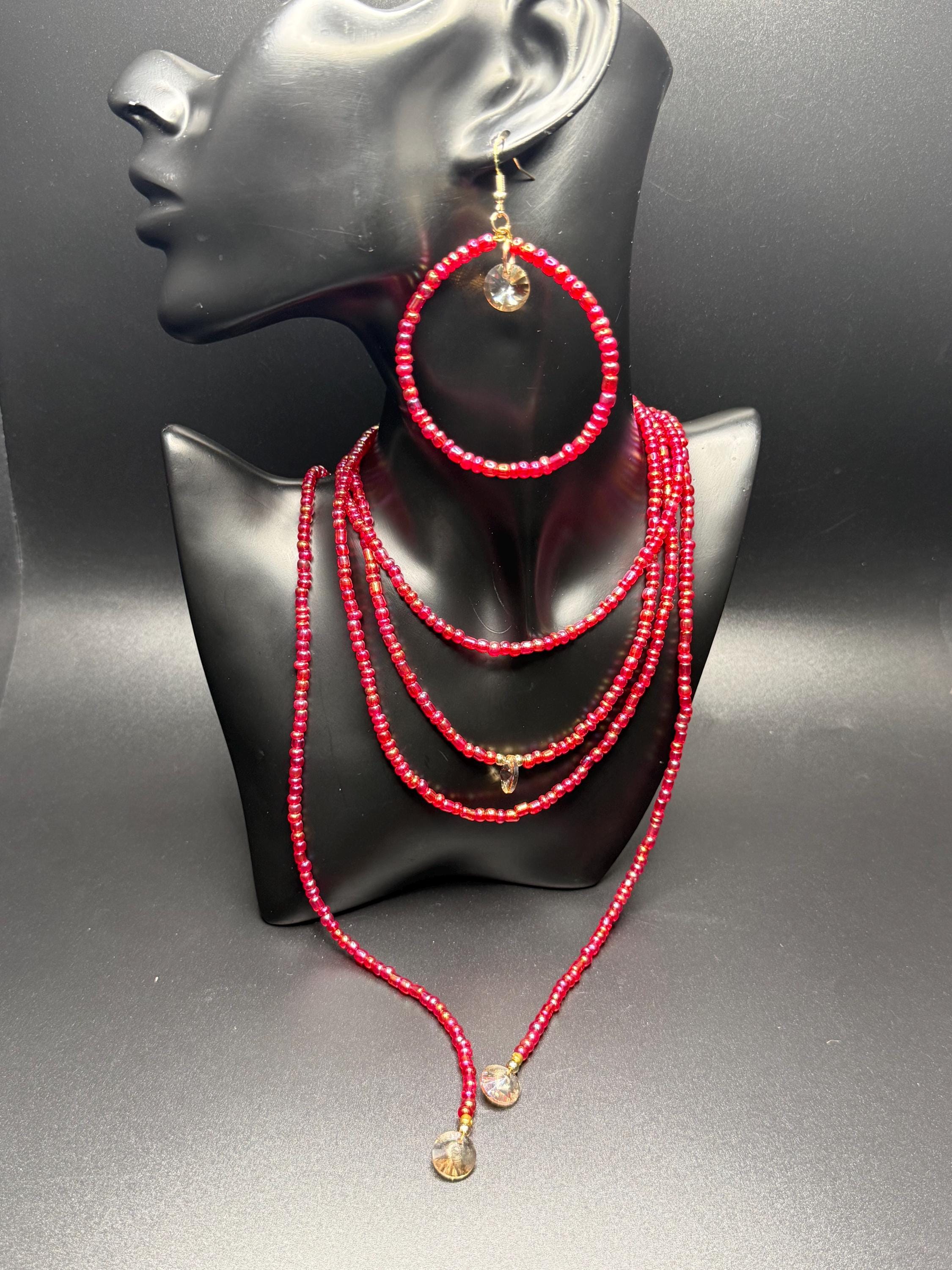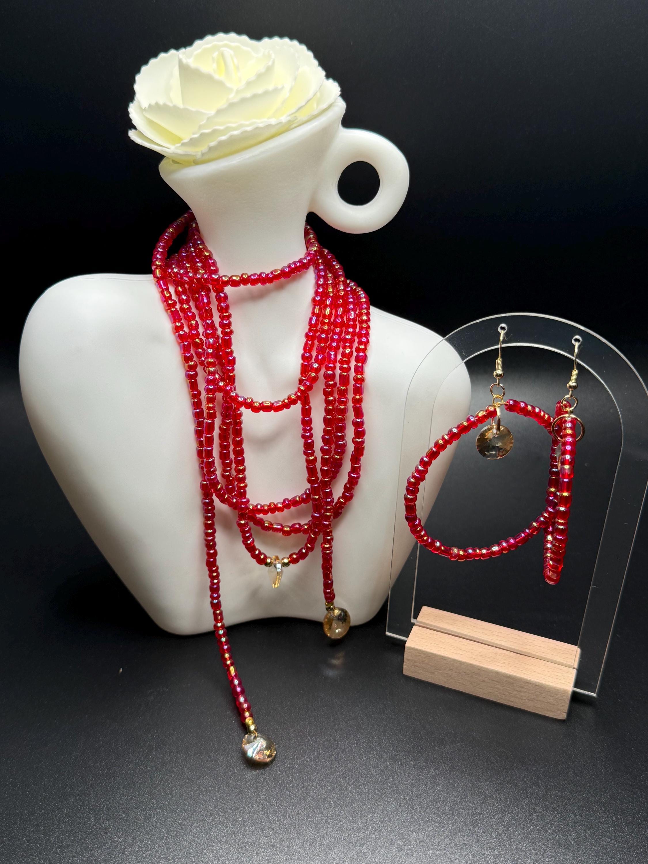 Red Iridescent Glass Beaded Long Necklace and Beaded Hoop Earrings
