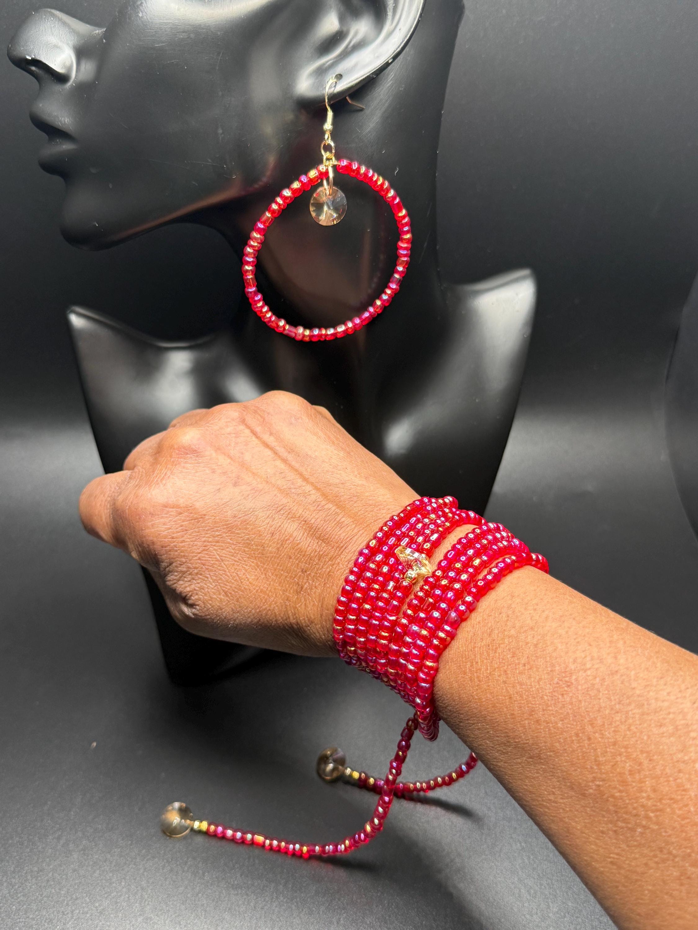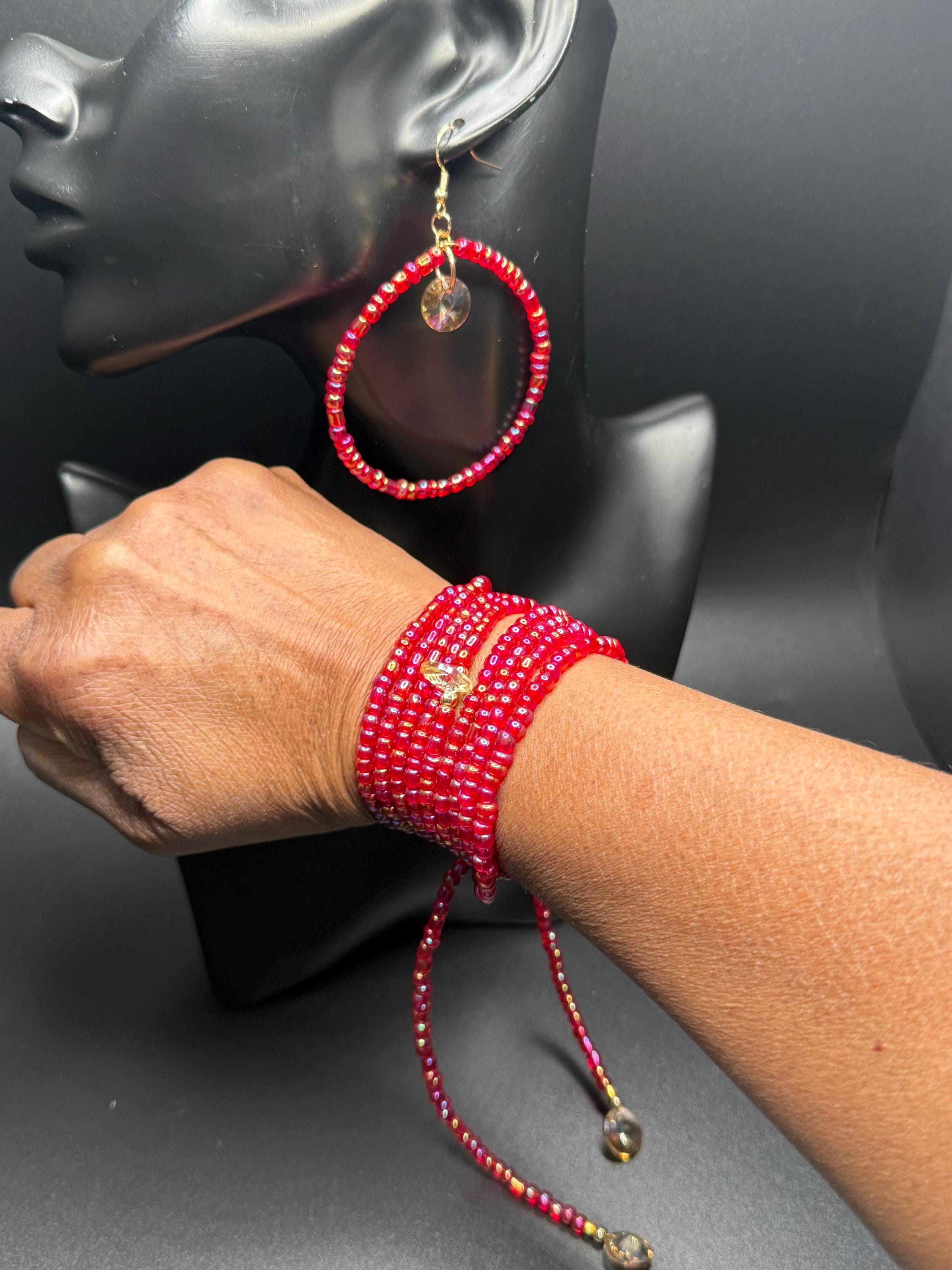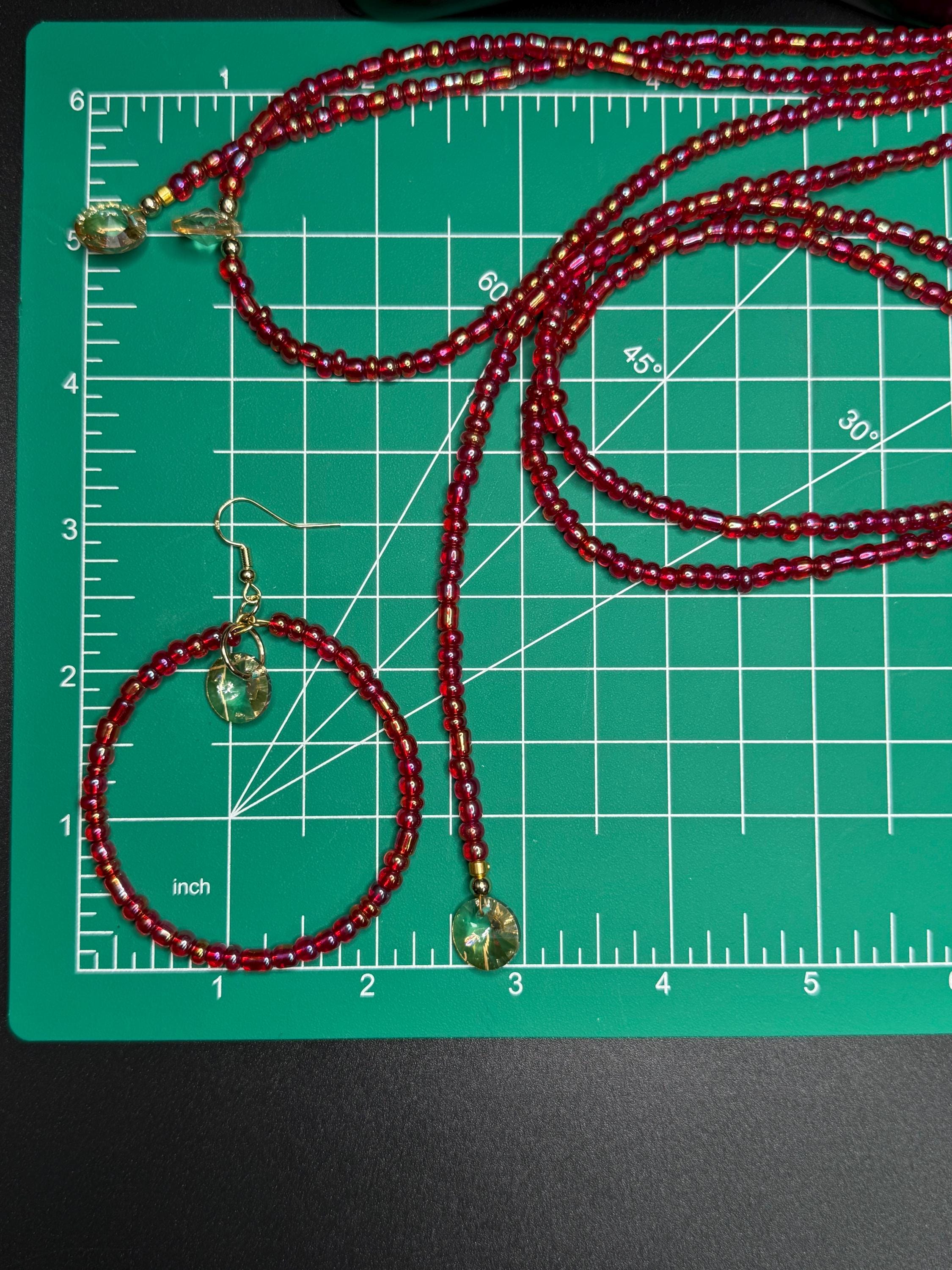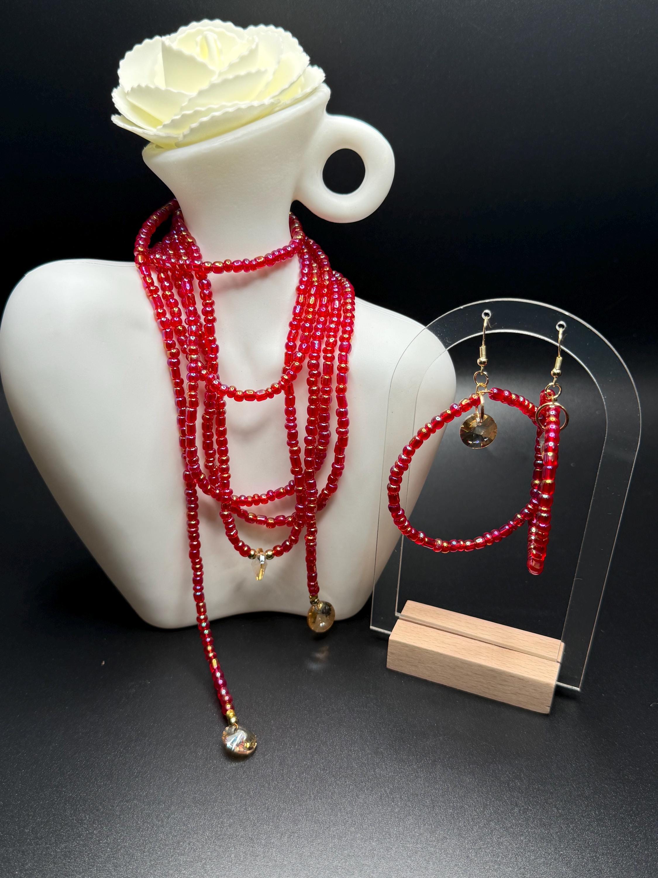 Red Iridescent Glass Beaded Long Necklace and Beaded Hoop Earrings