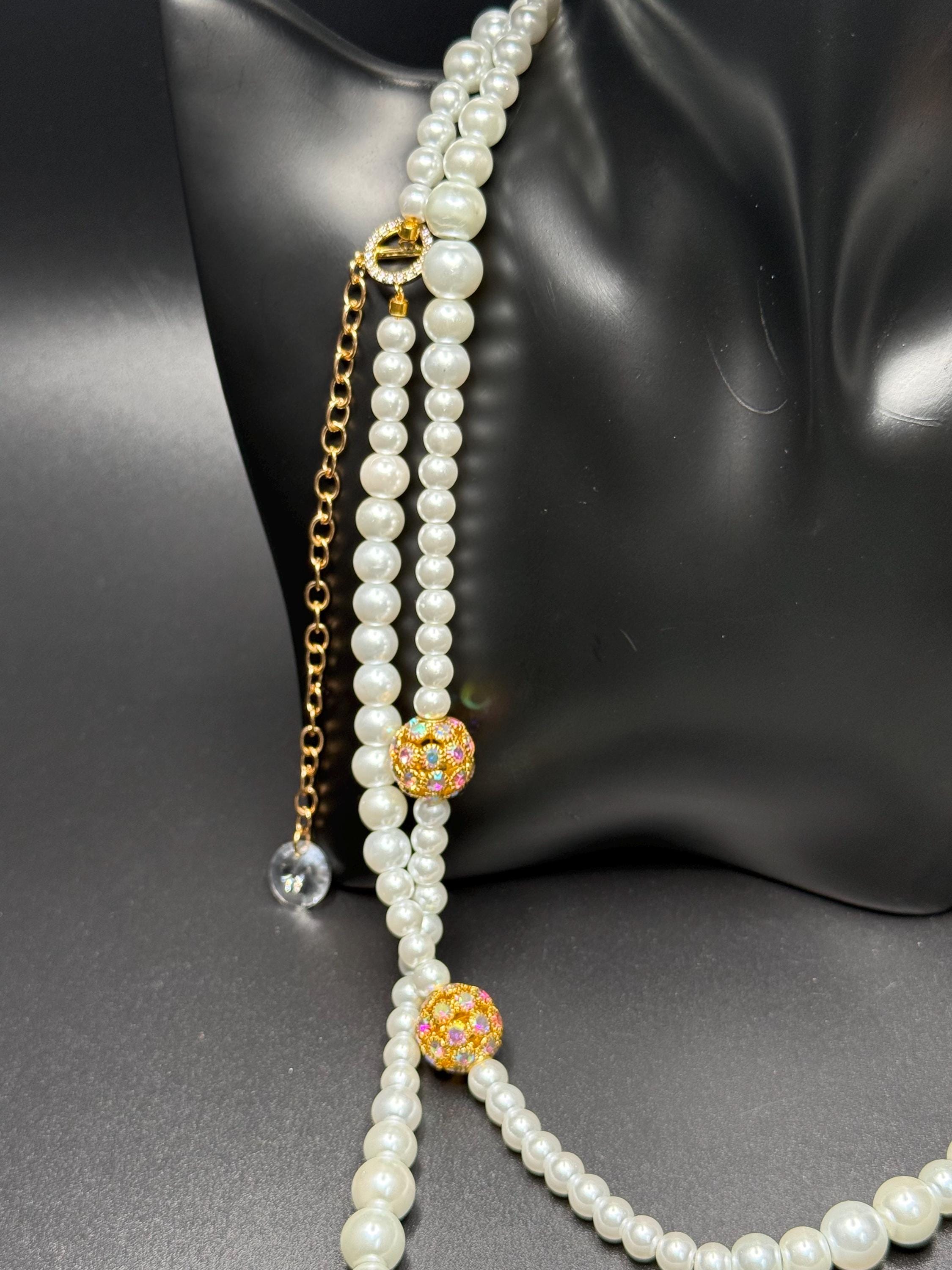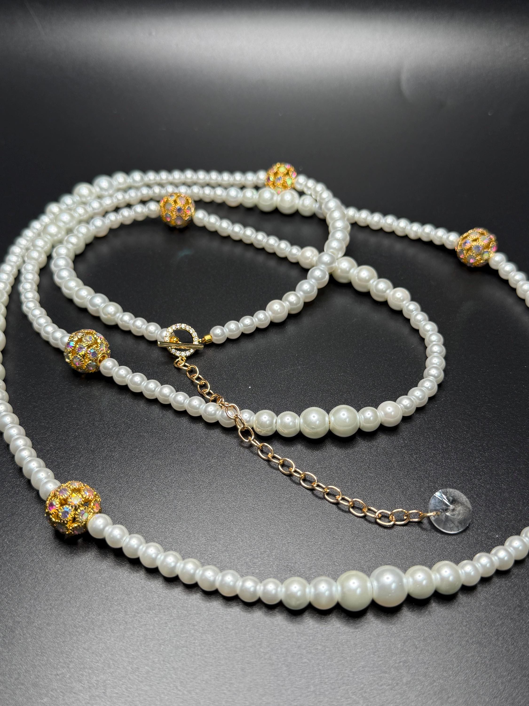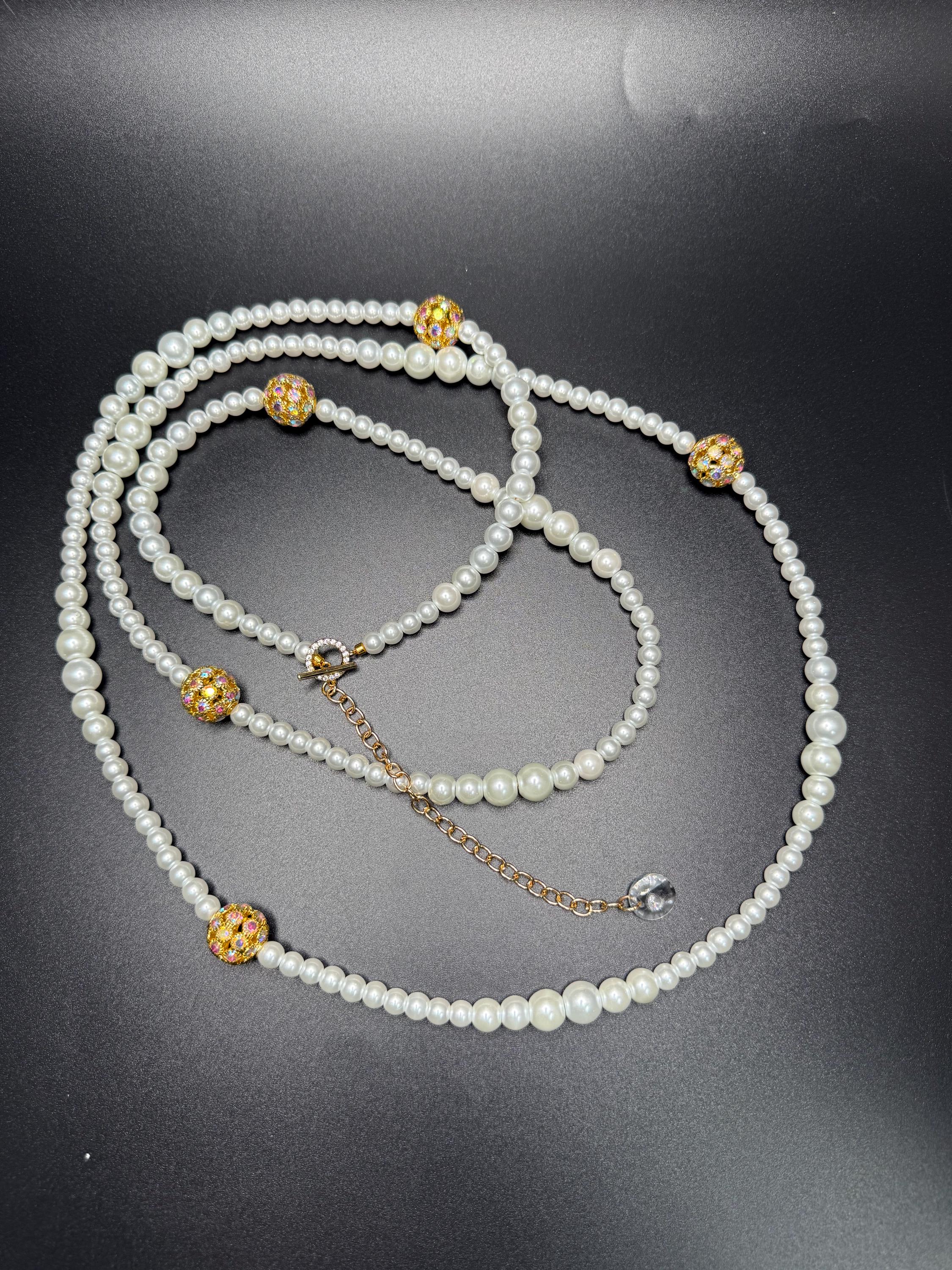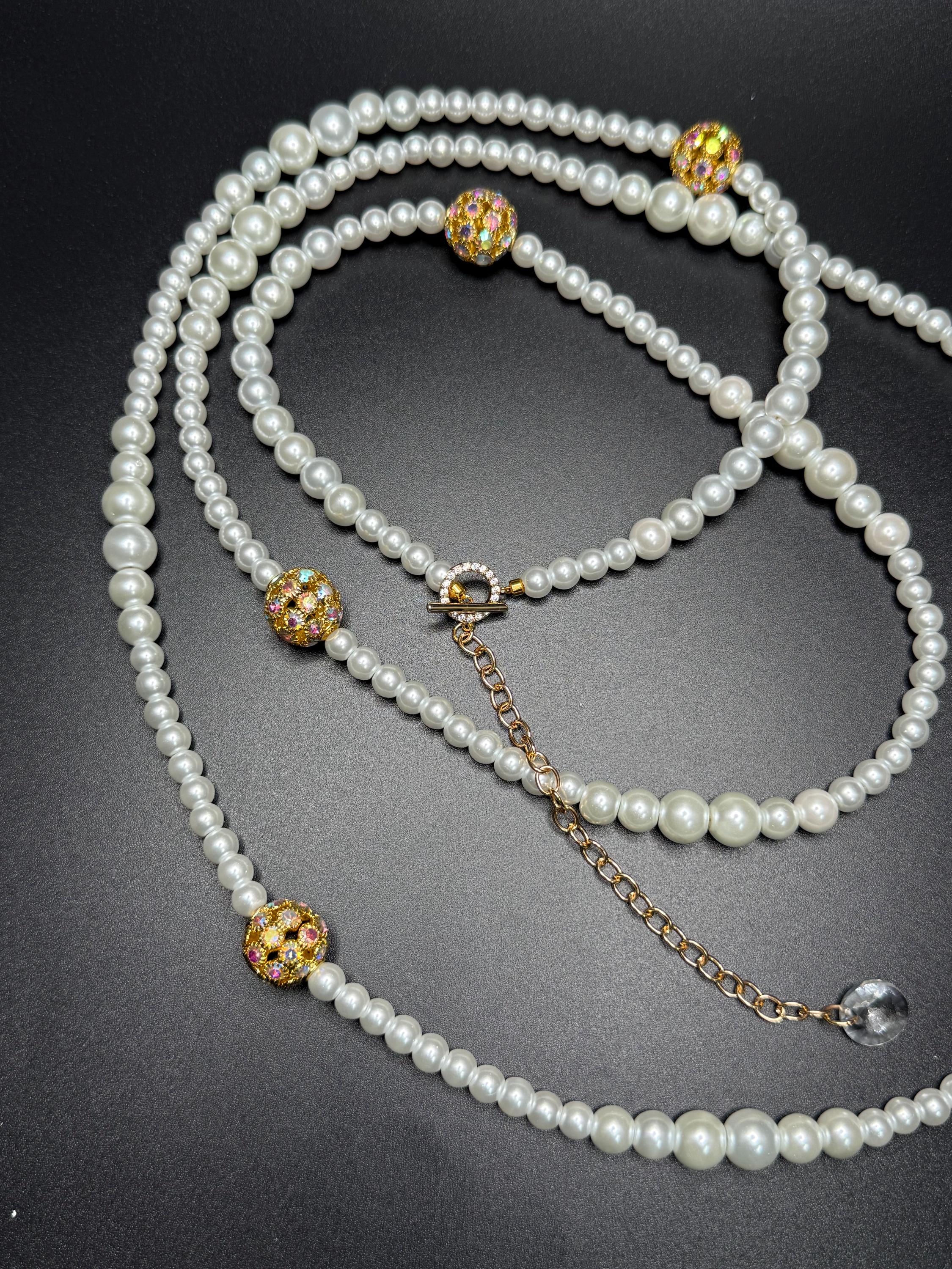 Long Pearl and Bling Beaded Necklace with Toggle Clasp and Long Extender Chain