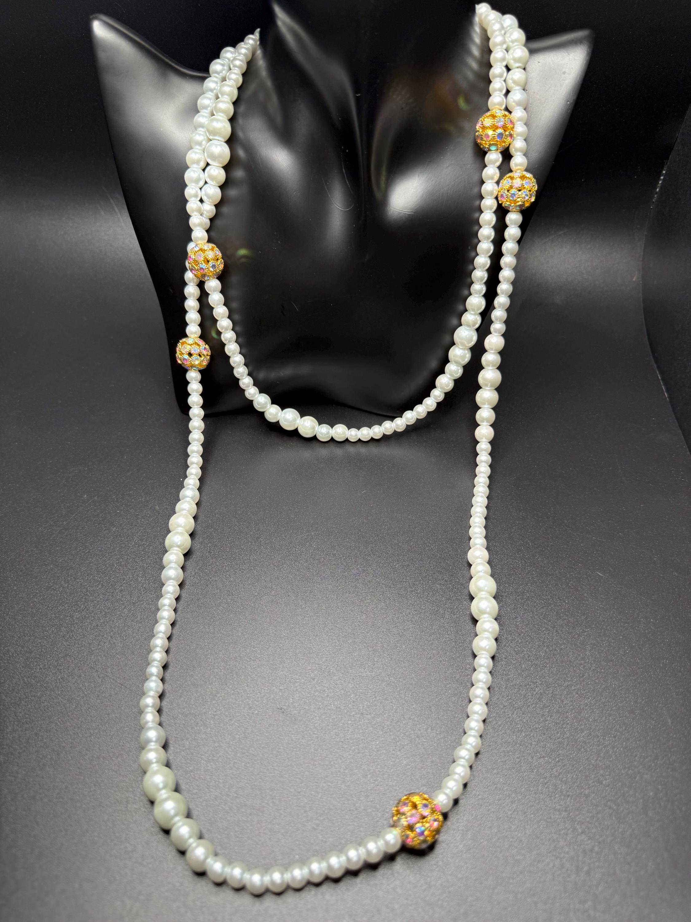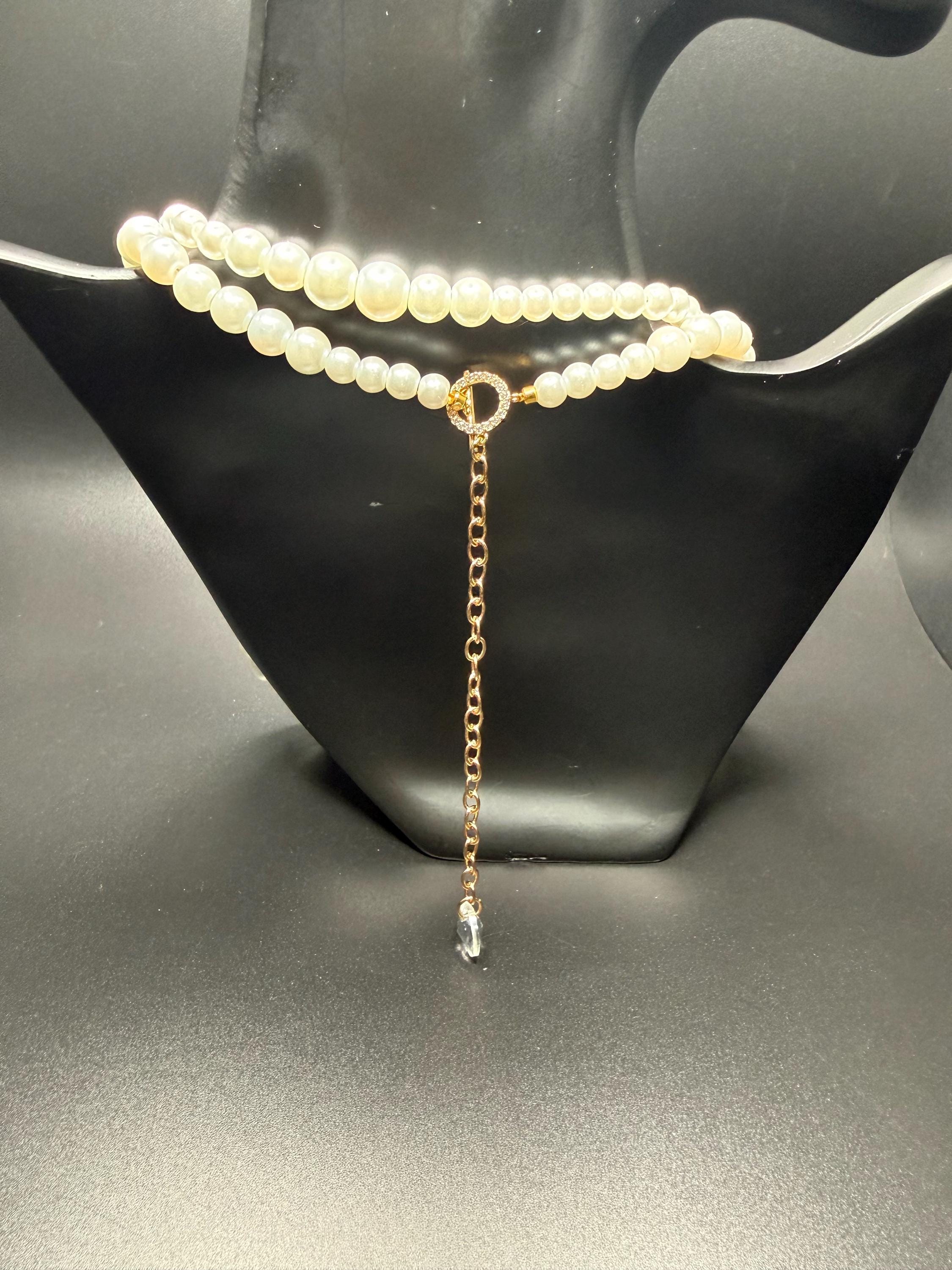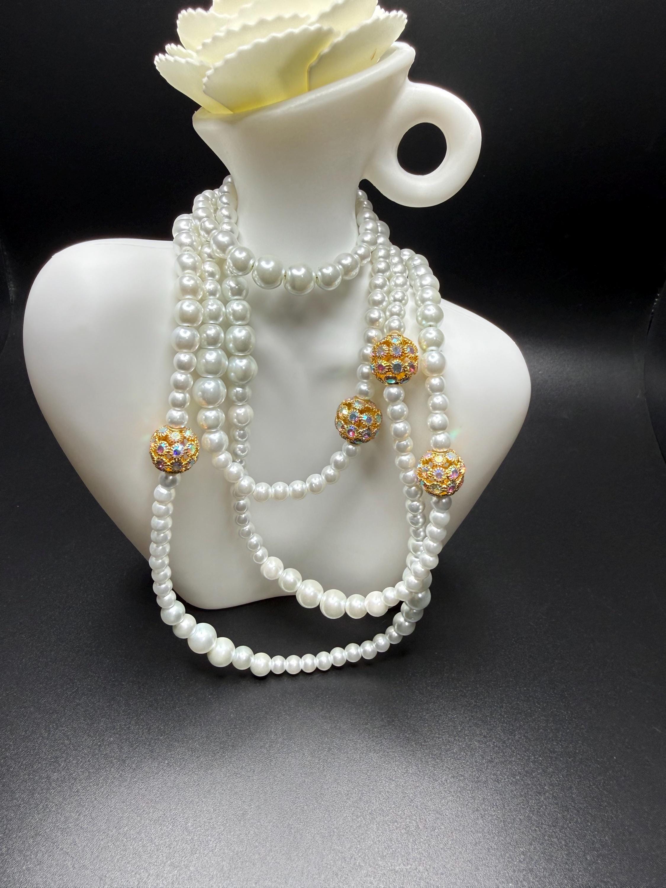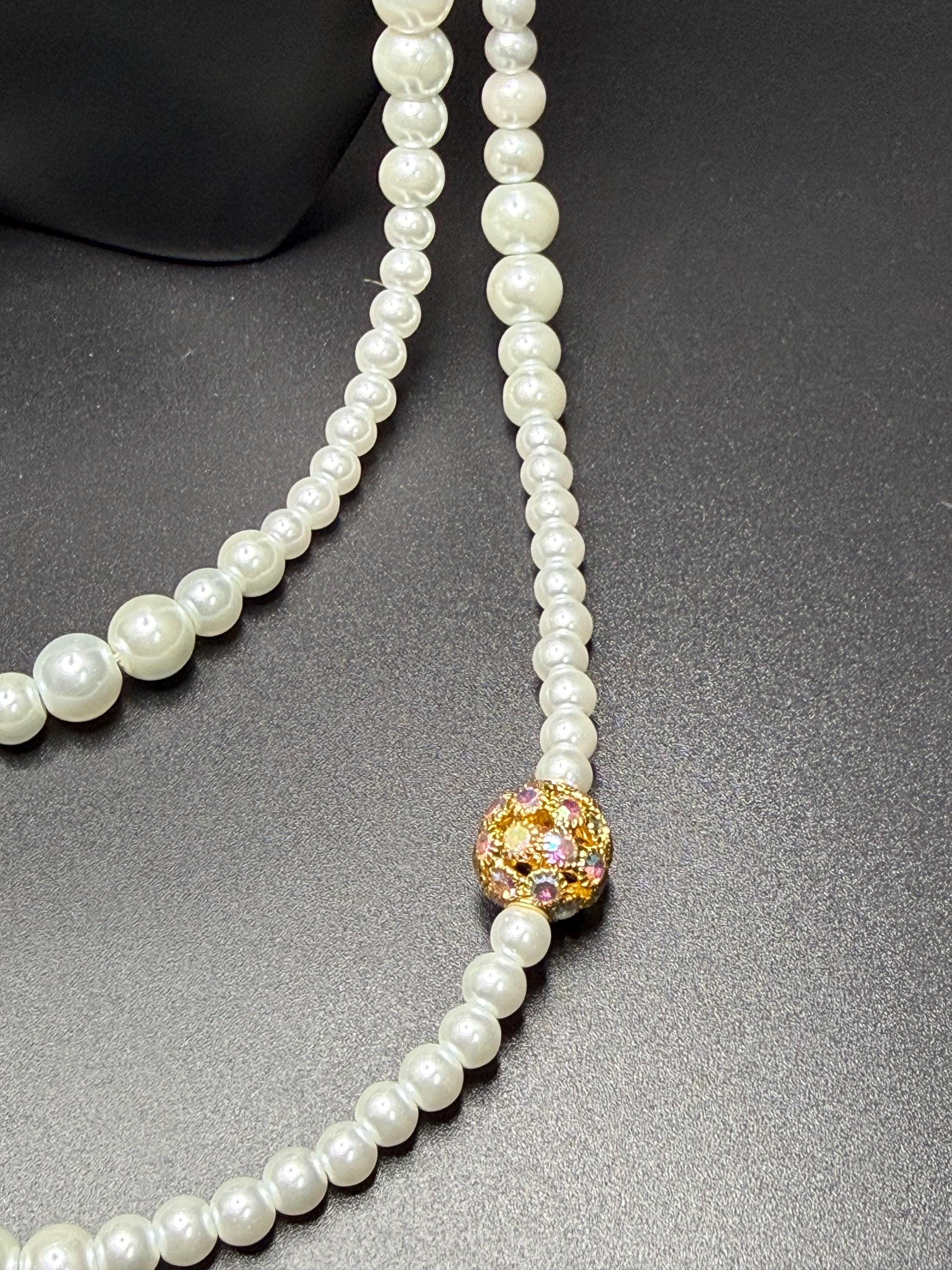 Long Pearl and Bling Beaded Necklace with Toggle Clasp and Long Extender Chain
