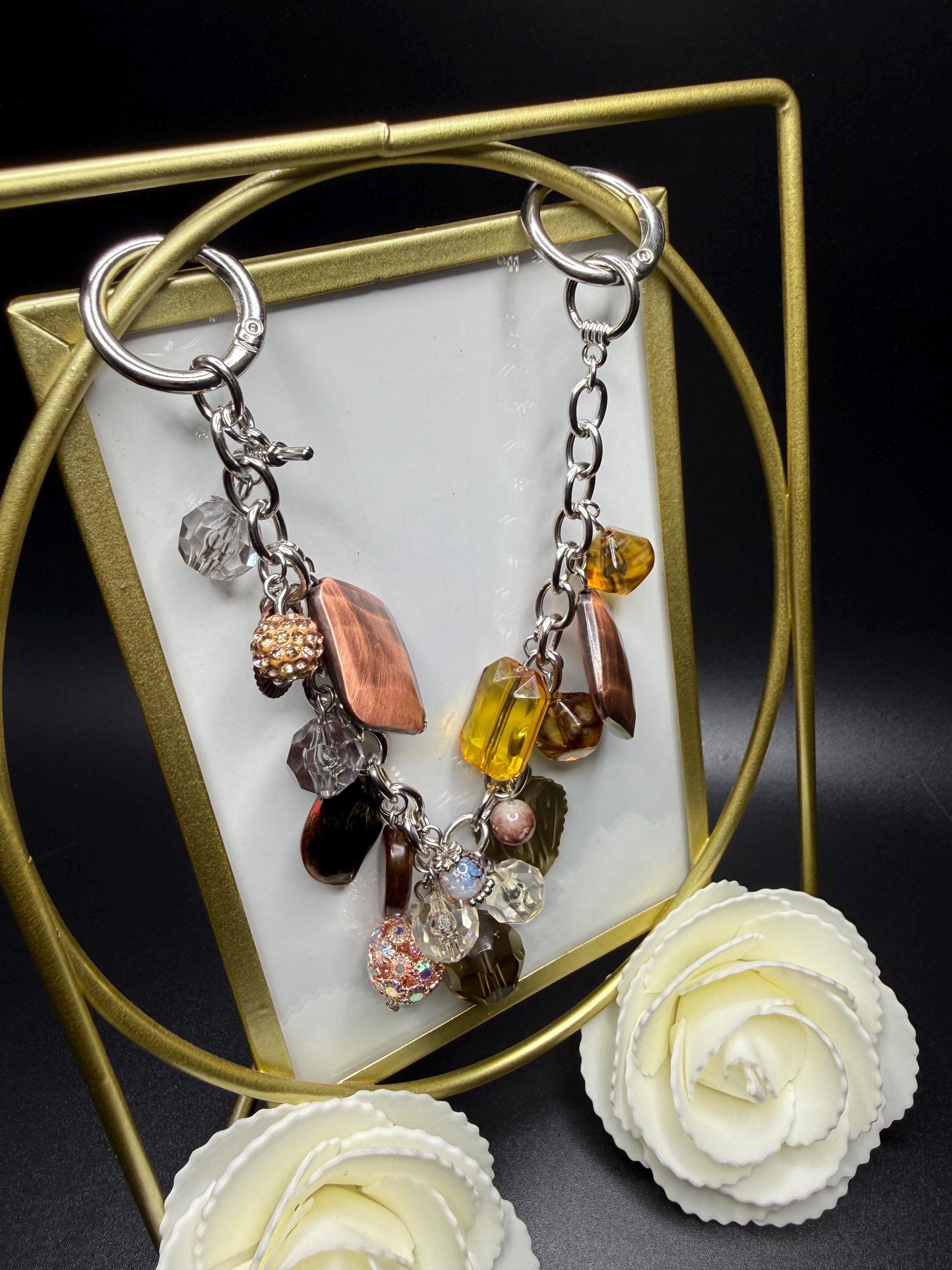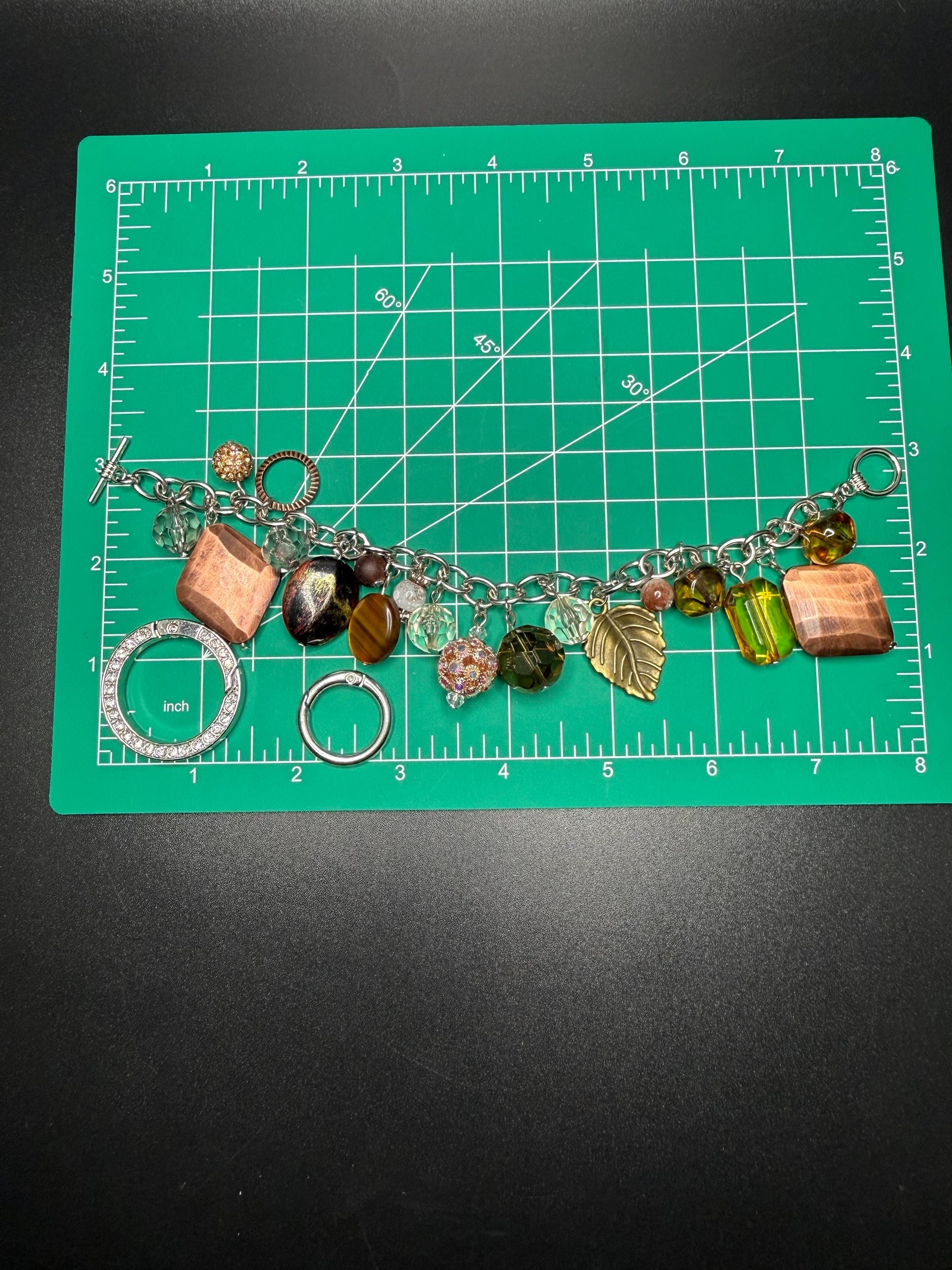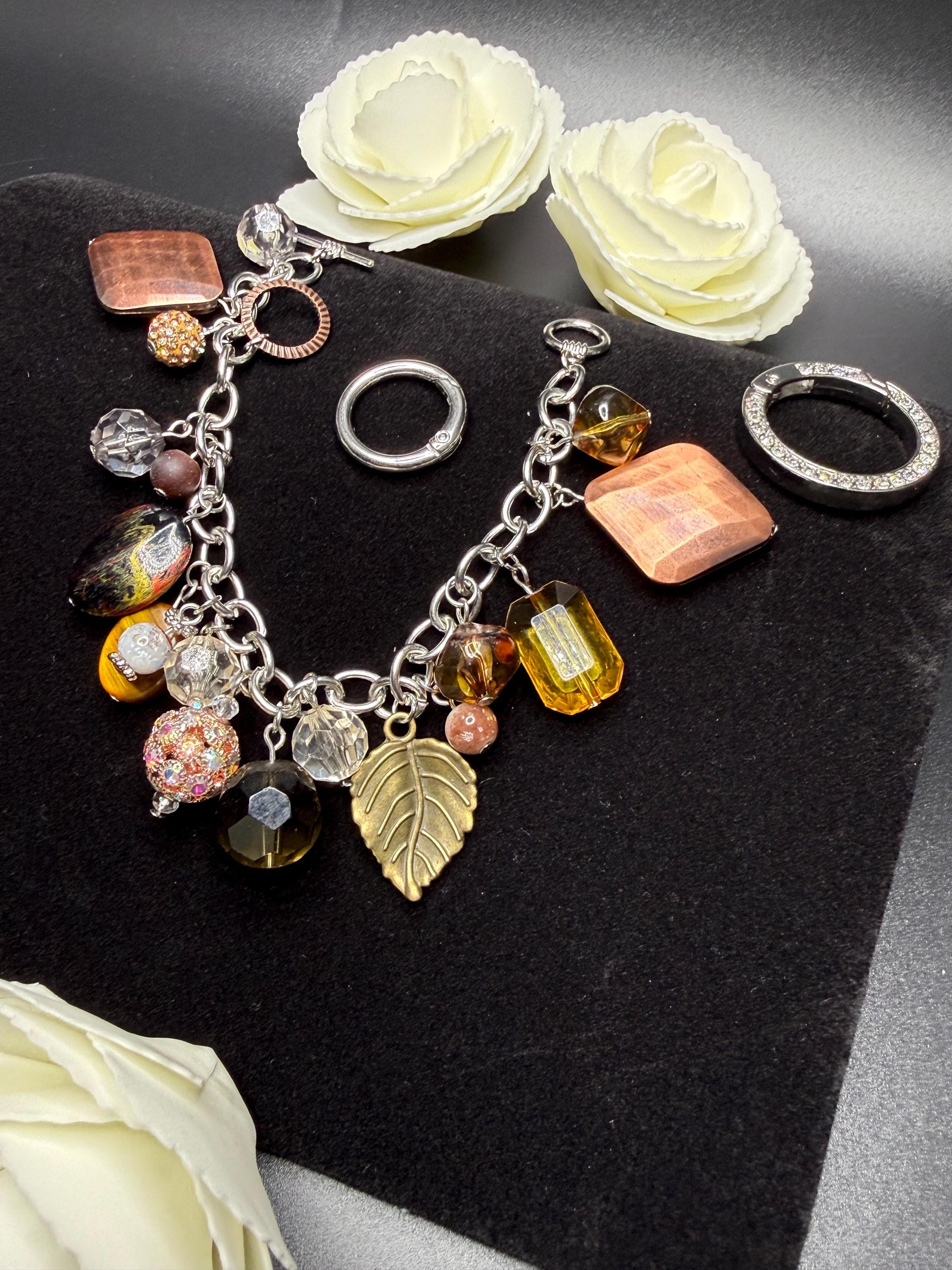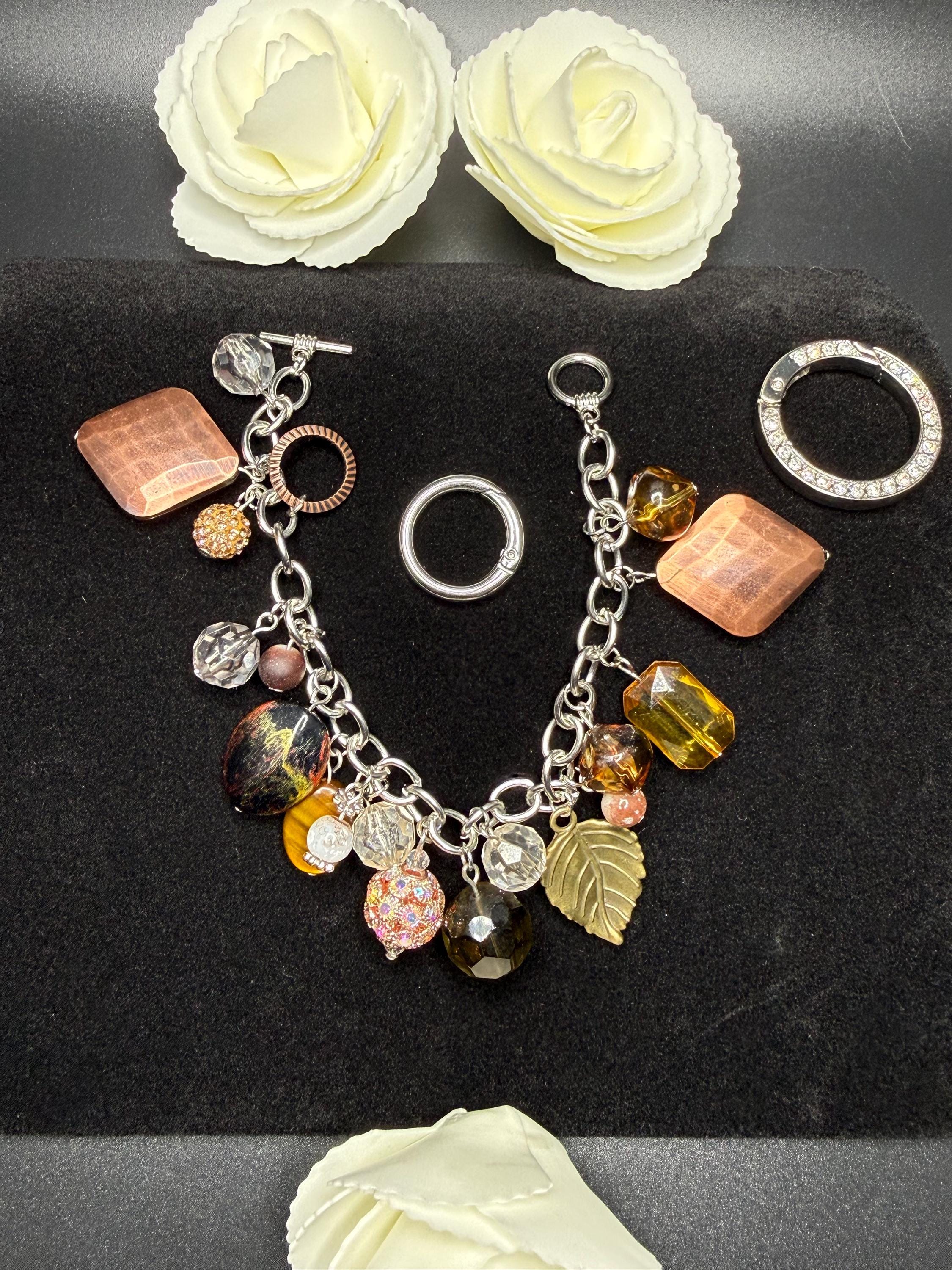 Copper and Silver Beaded Purse Bracelet with Brass Leaf Charm and Bling “O” ring