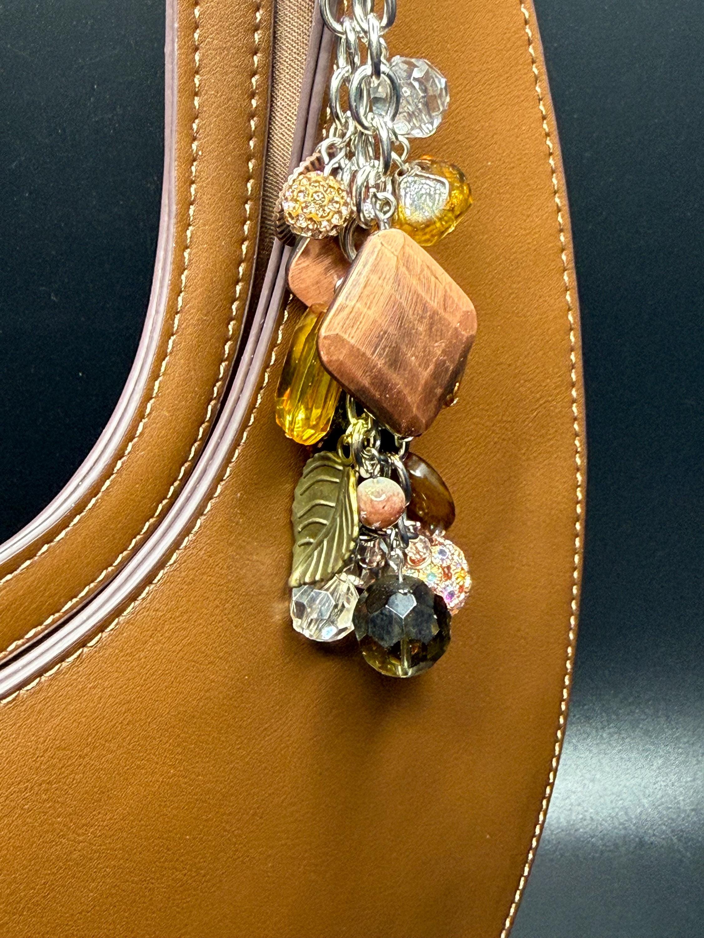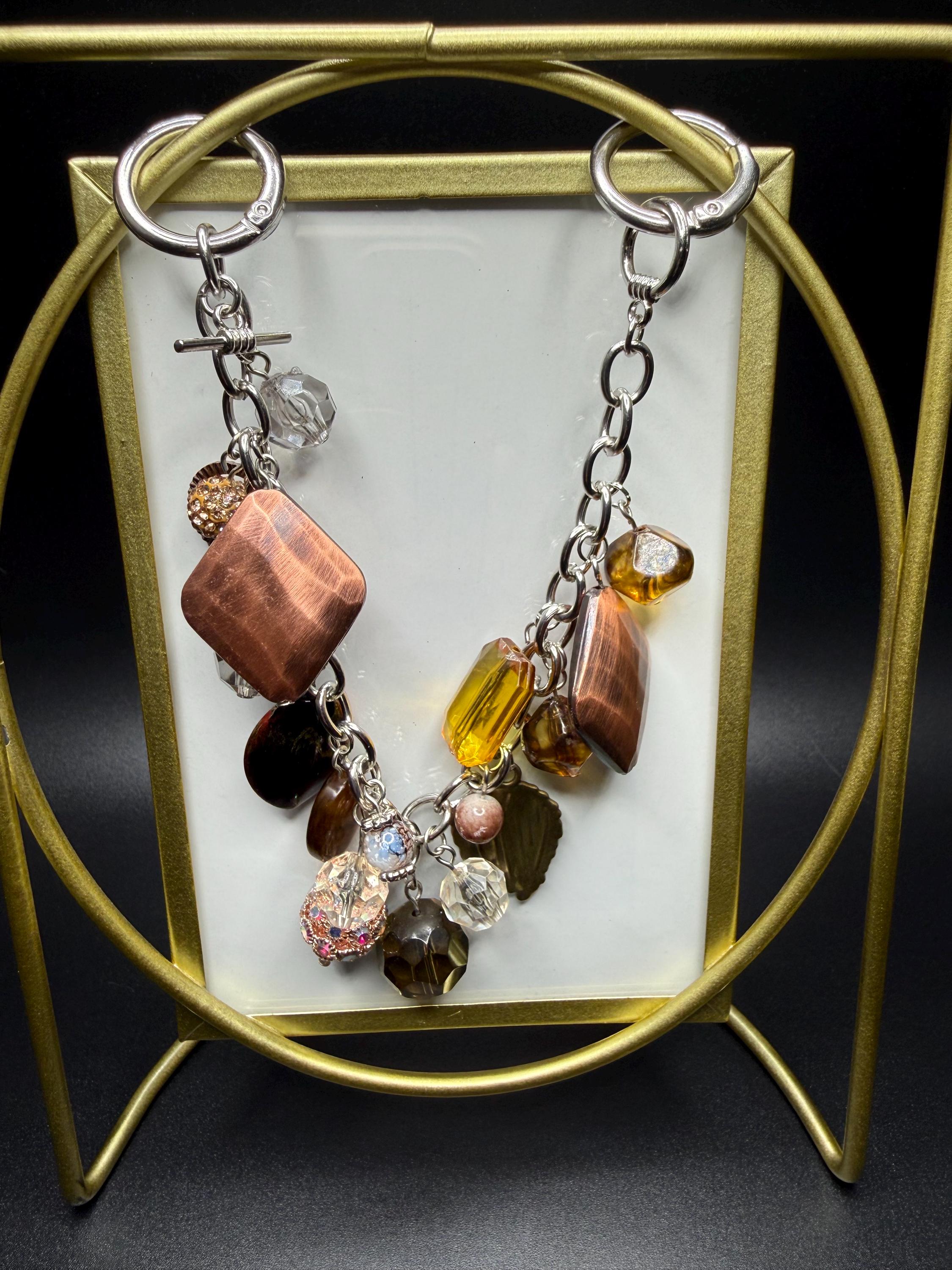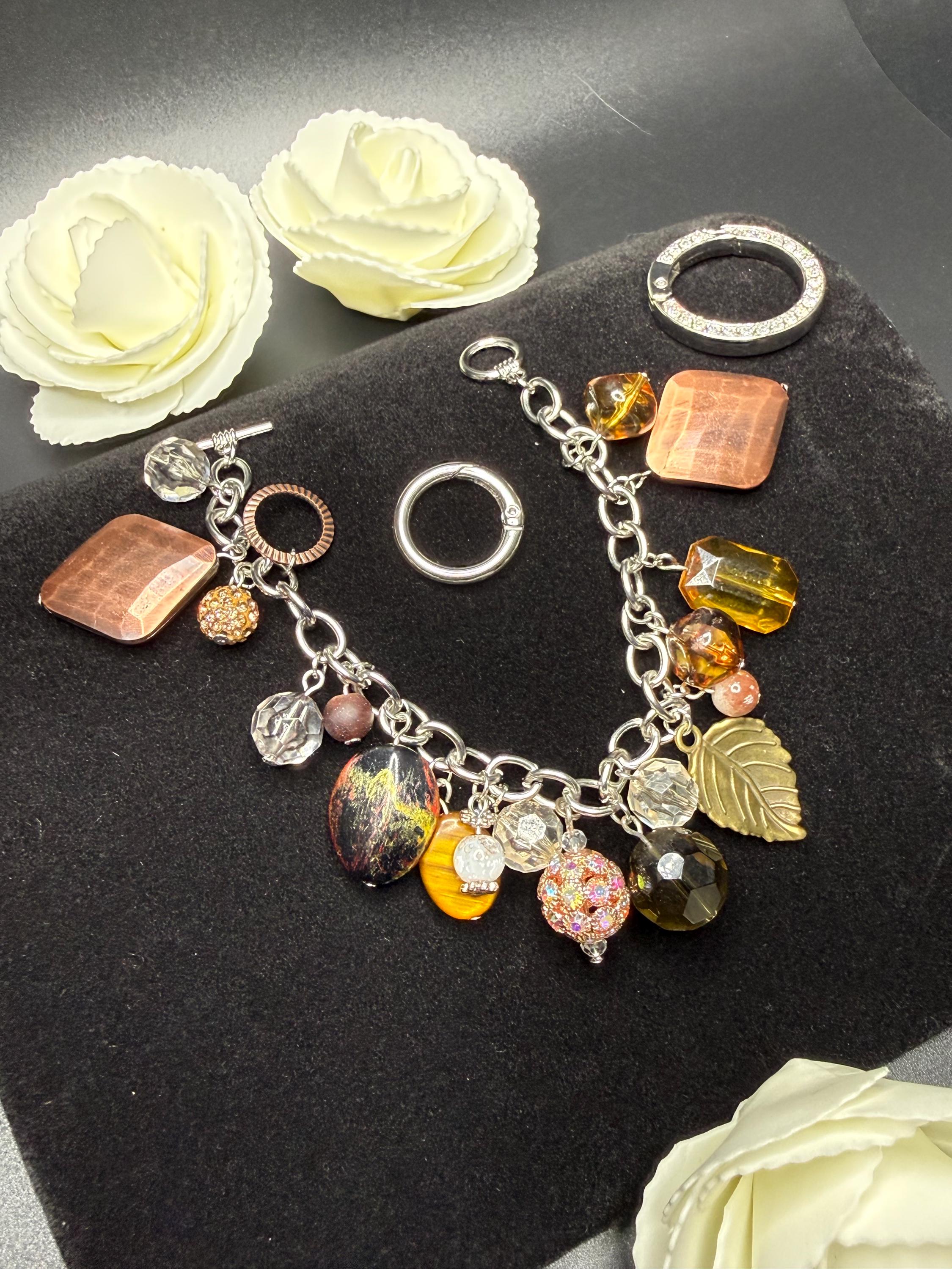 Copper and Silver Beaded Purse Bracelet with Brass Leaf Charm and Bling “O” ring