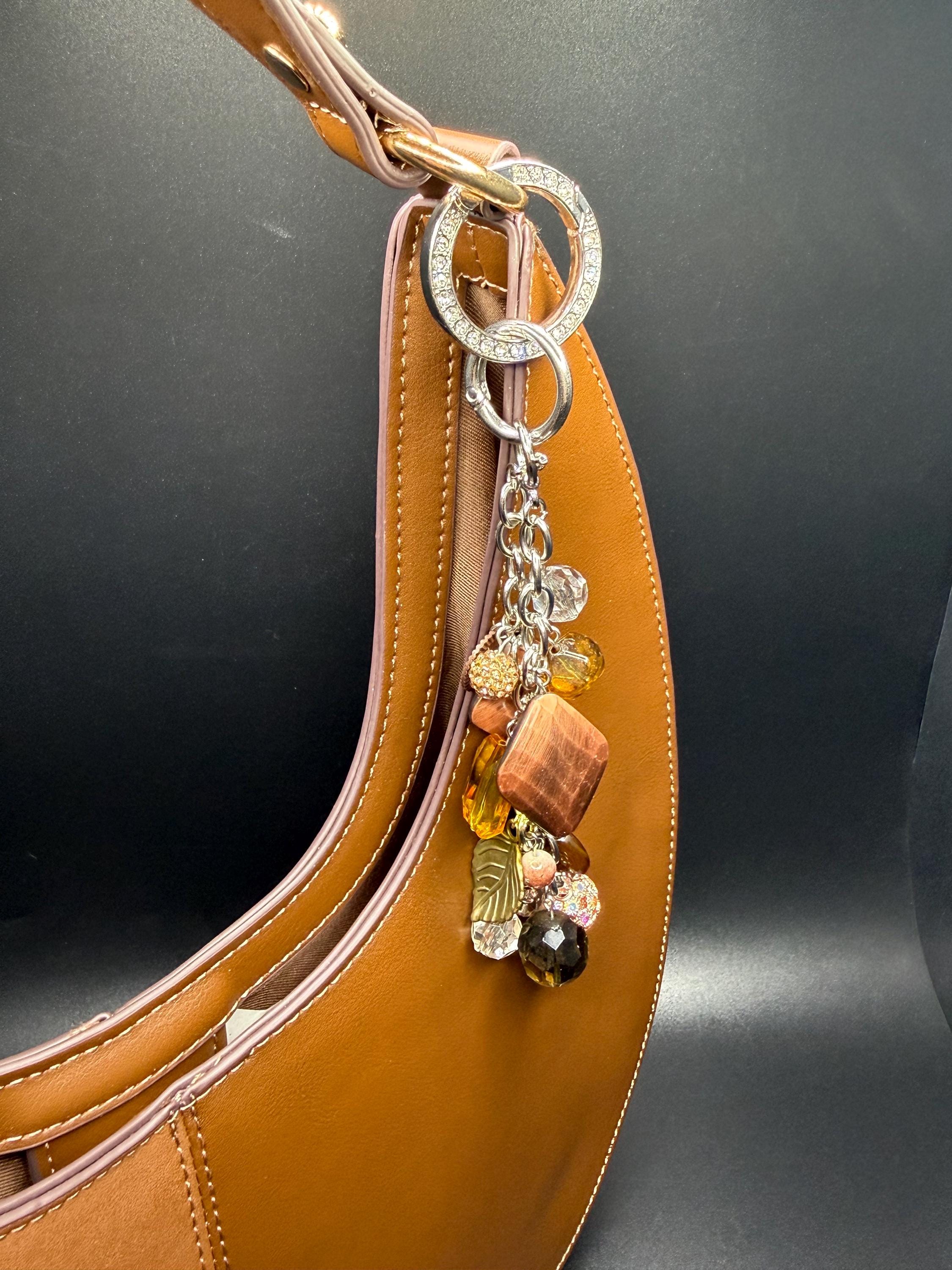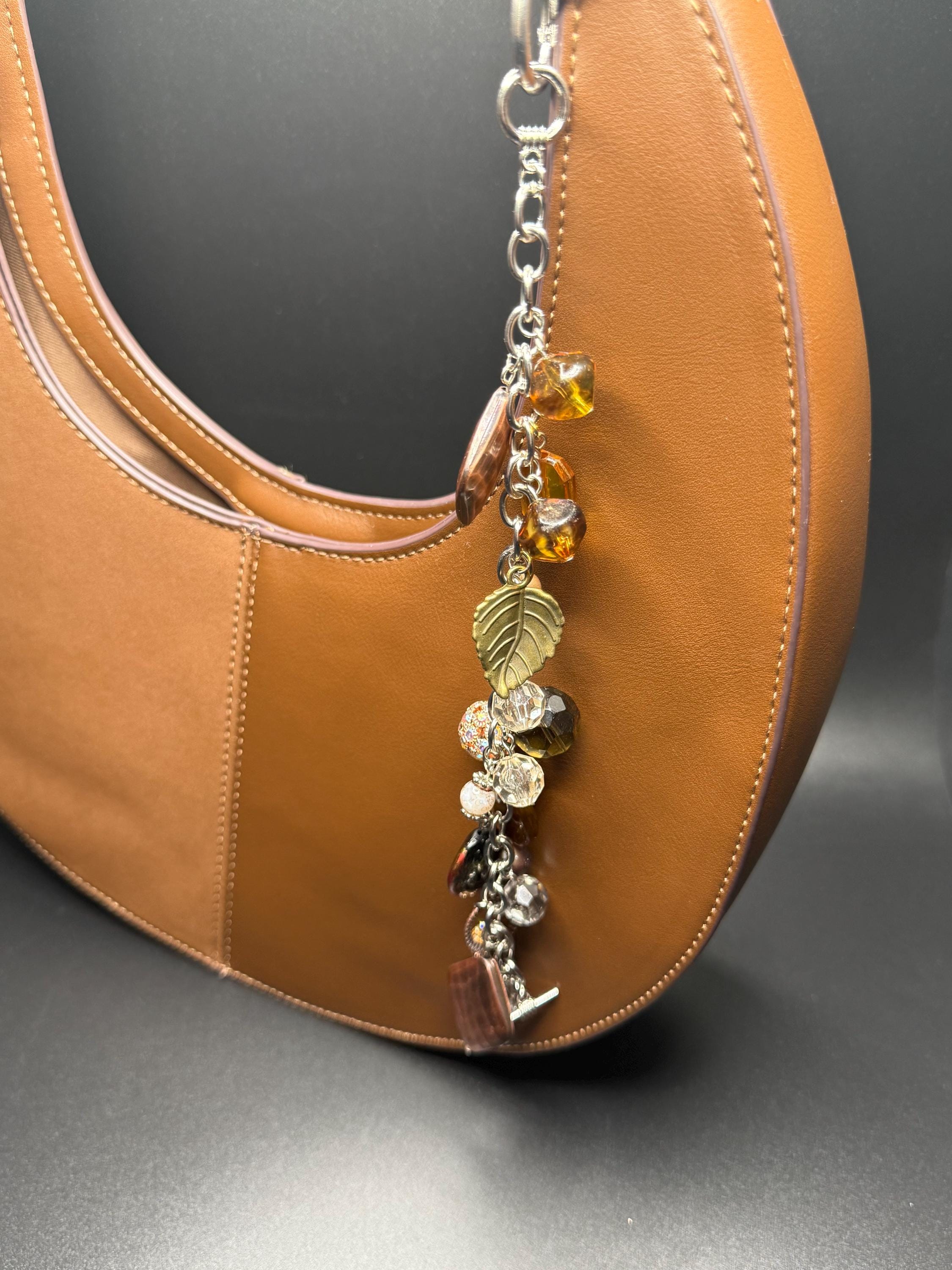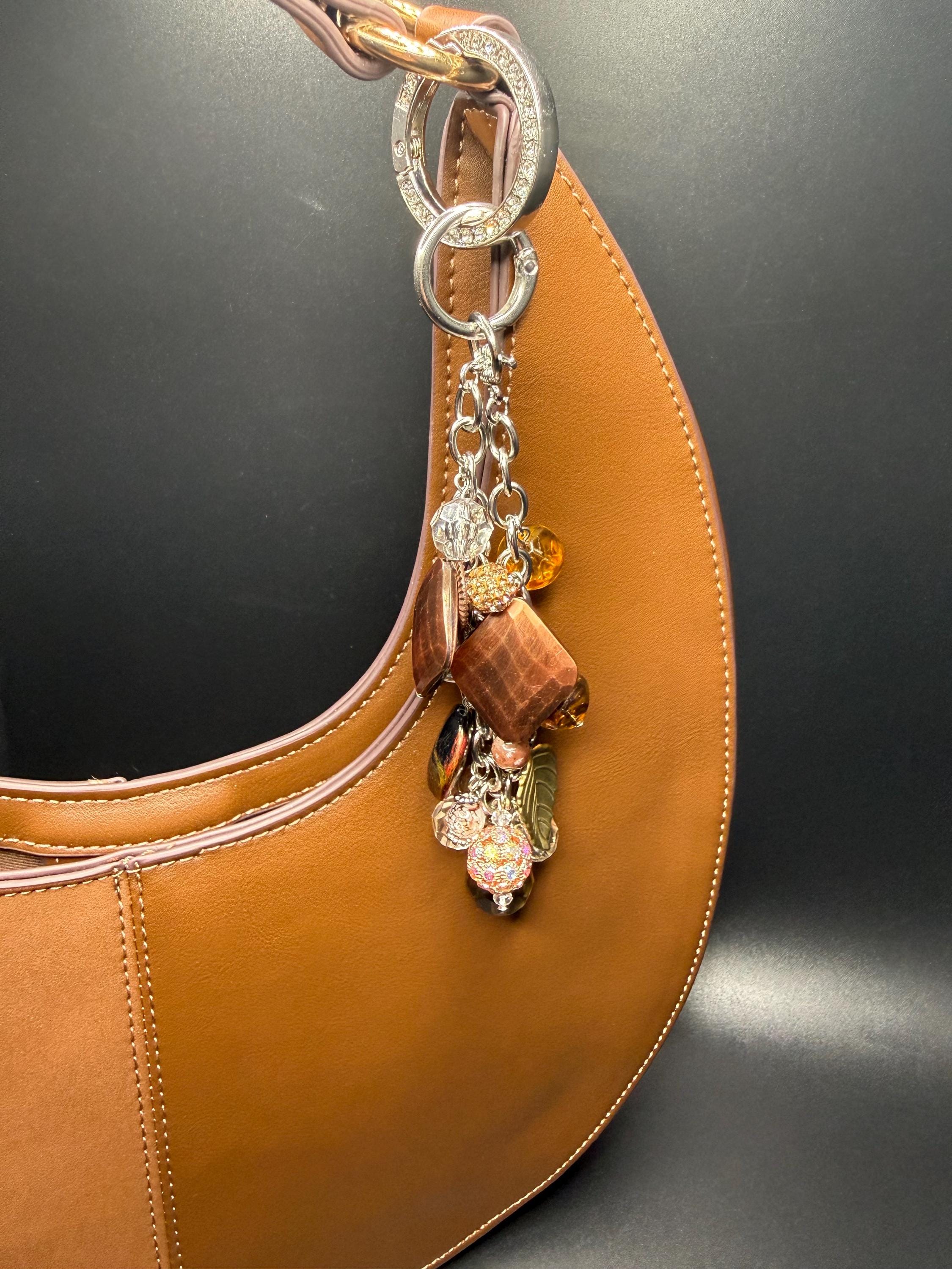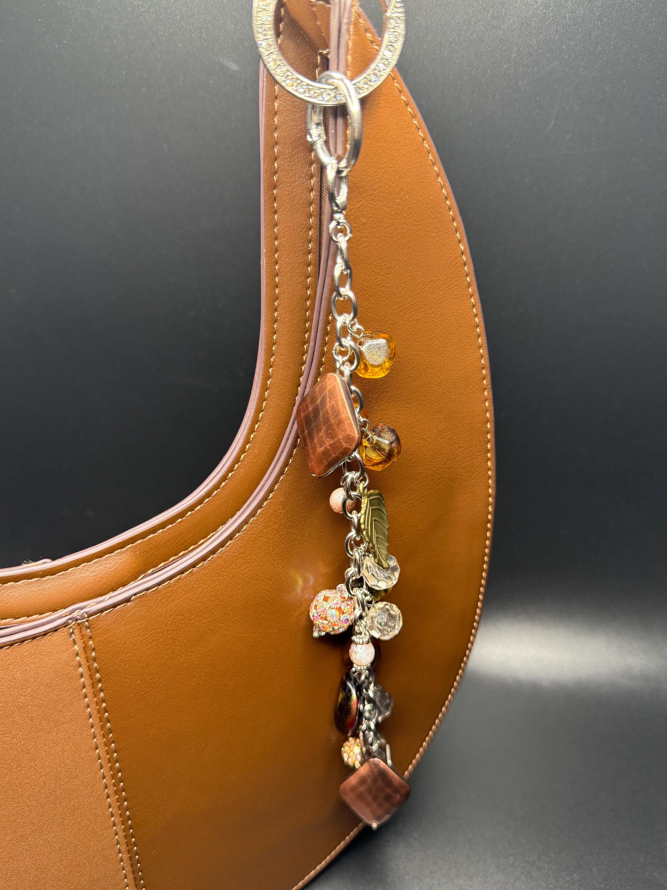 Copper and Silver Beaded Purse Bracelet with Brass Leaf Charm and Bling “O” ring
