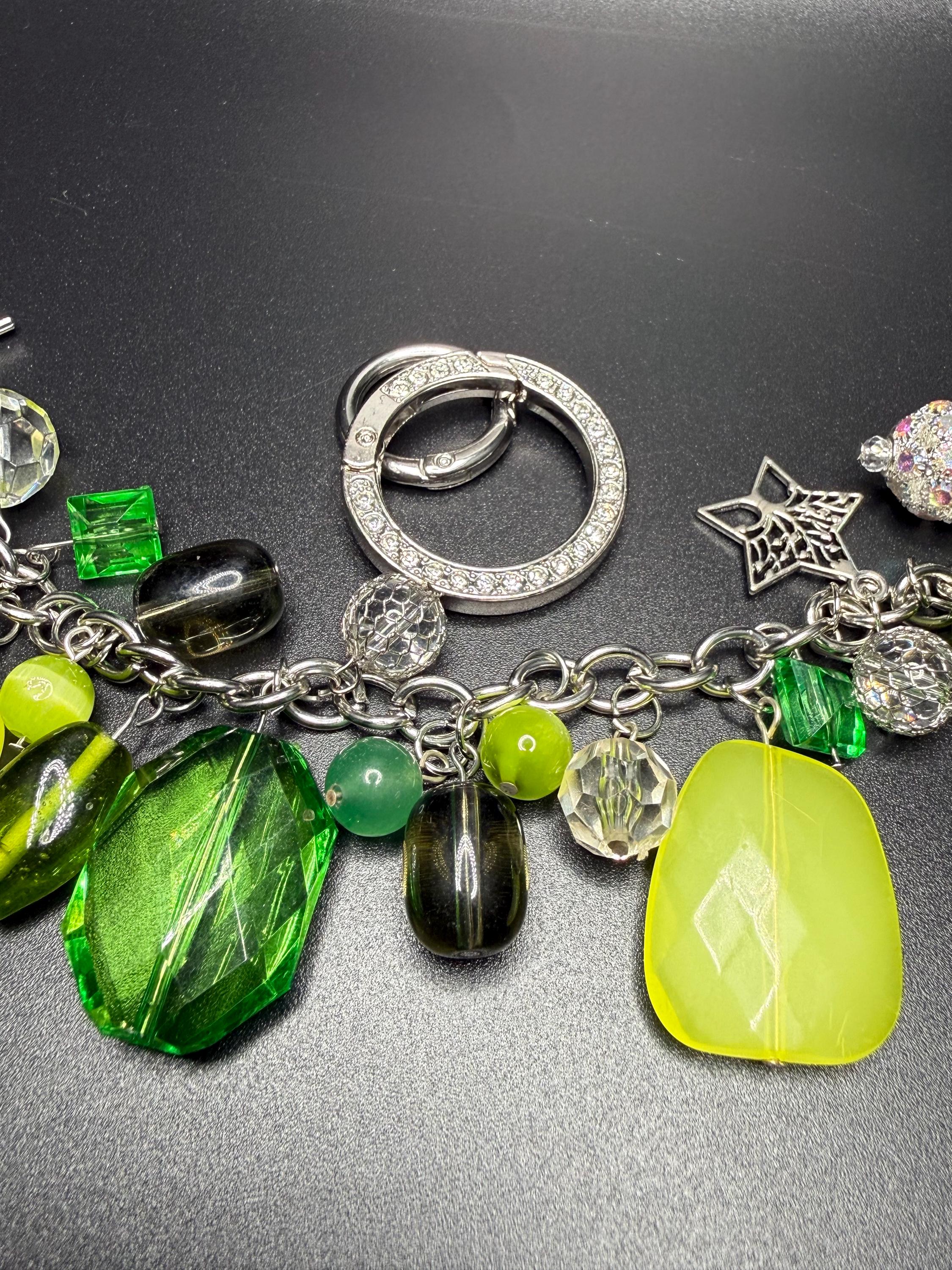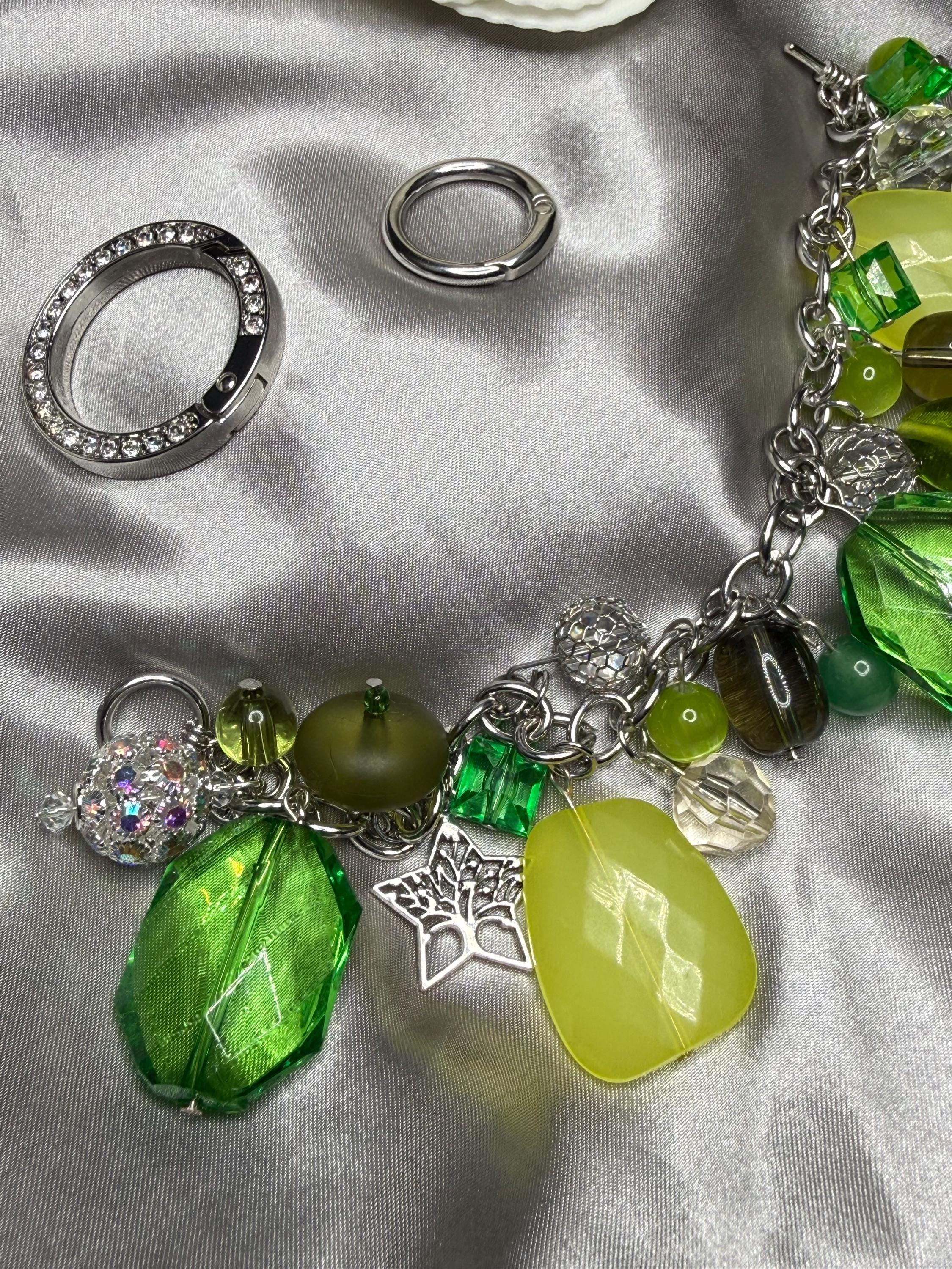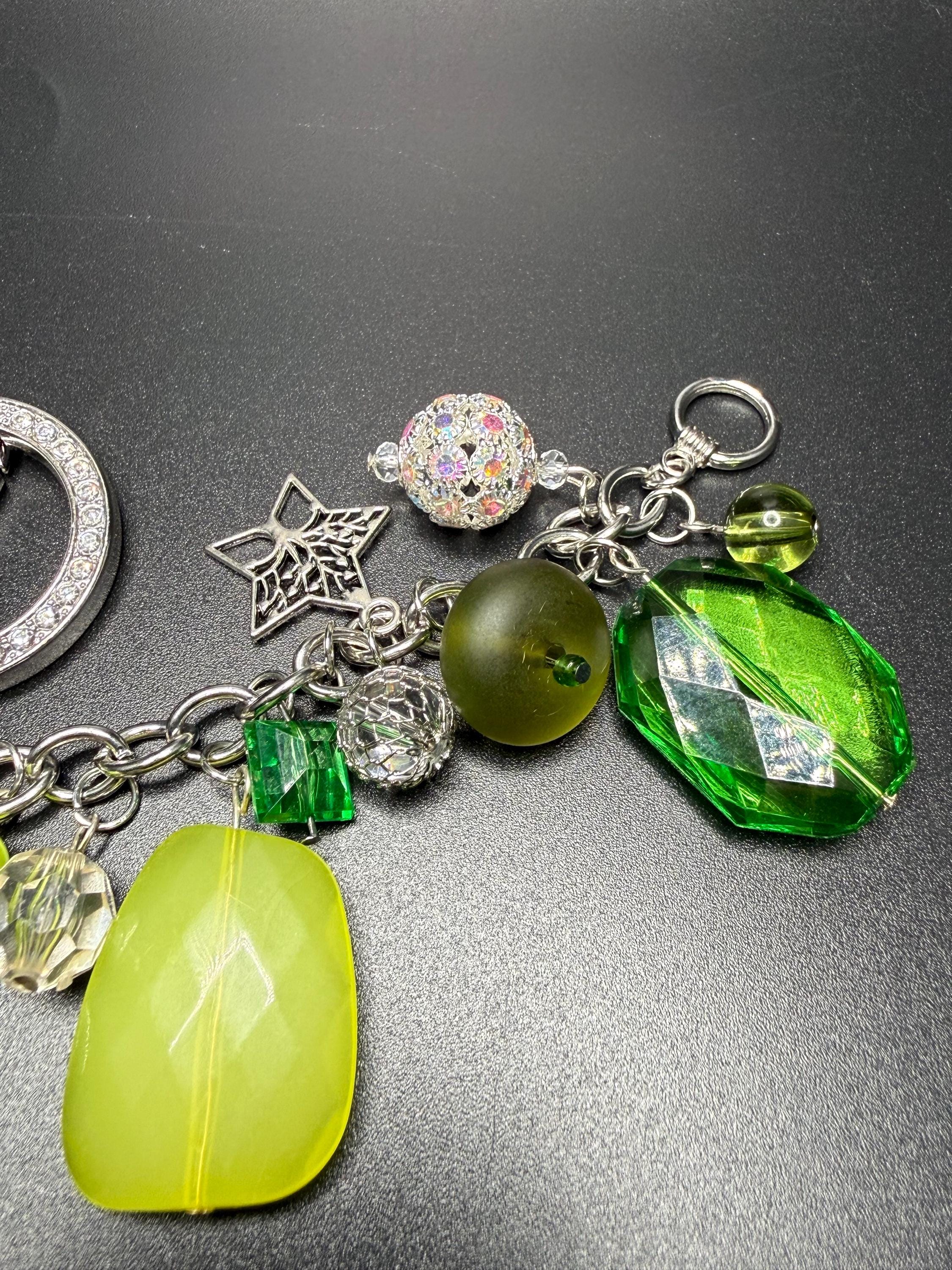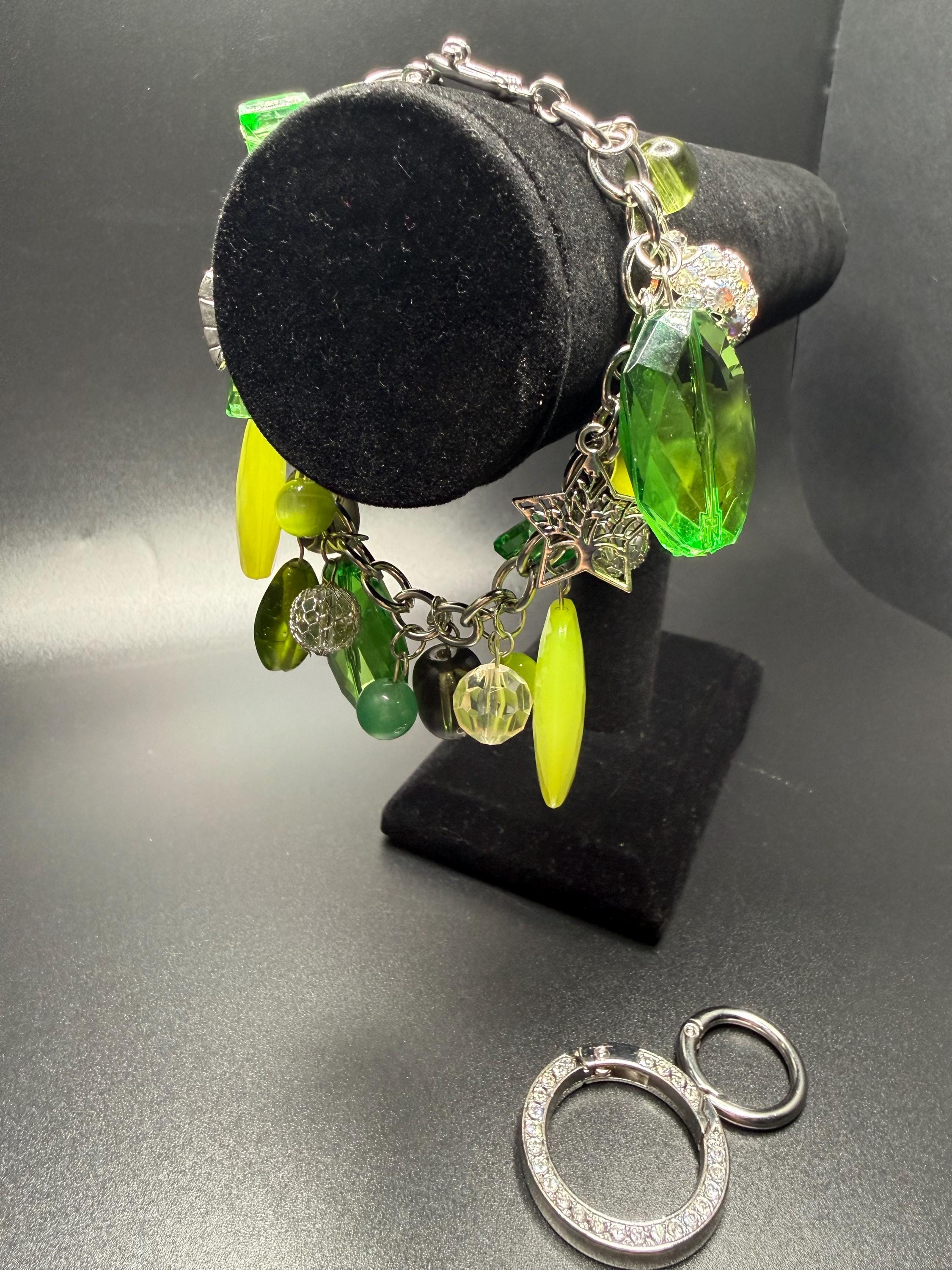 Silver Charm and Green Beaded Purse Bracelet with Star and Leaf Charms and Bling “O” ring