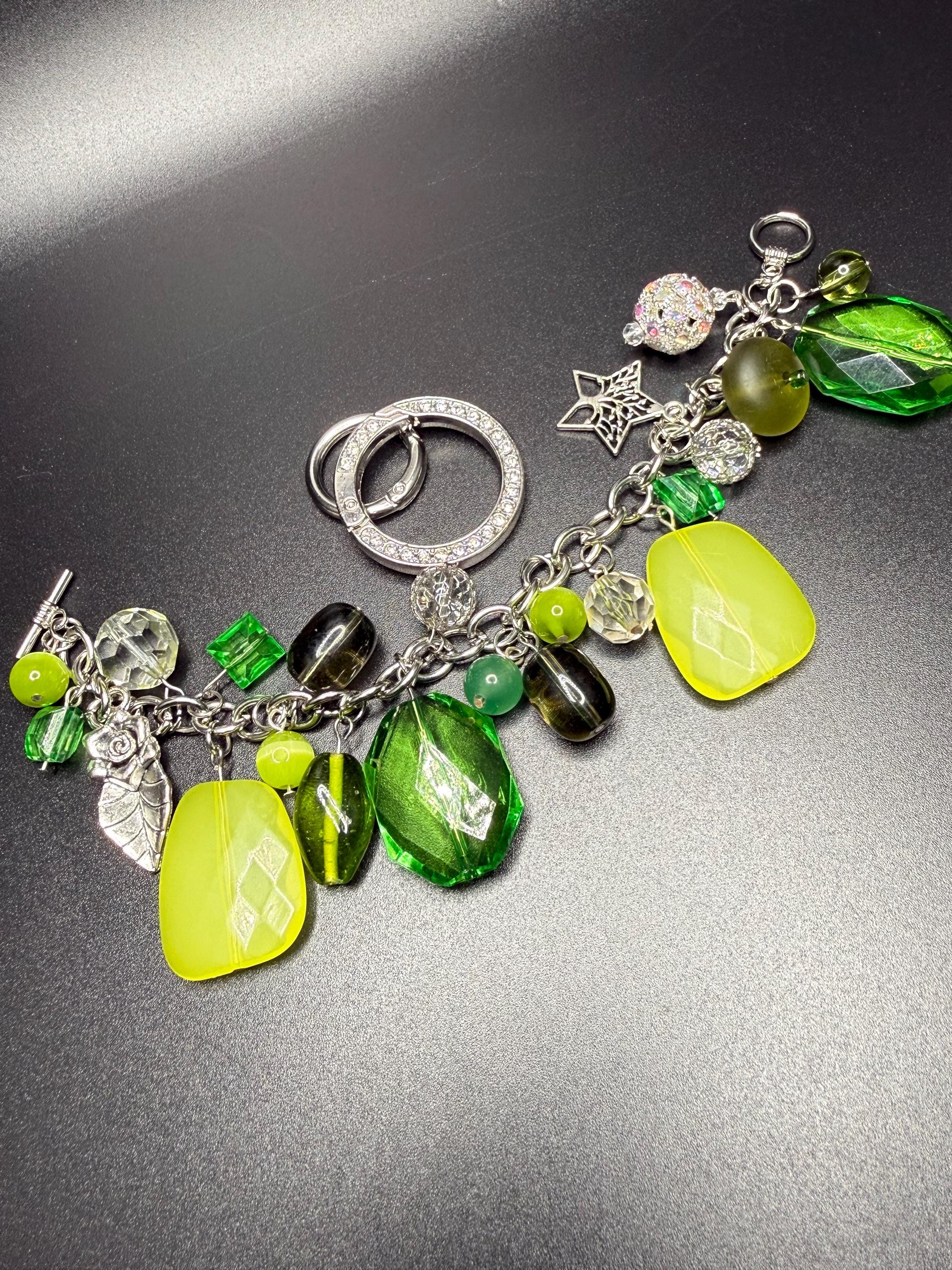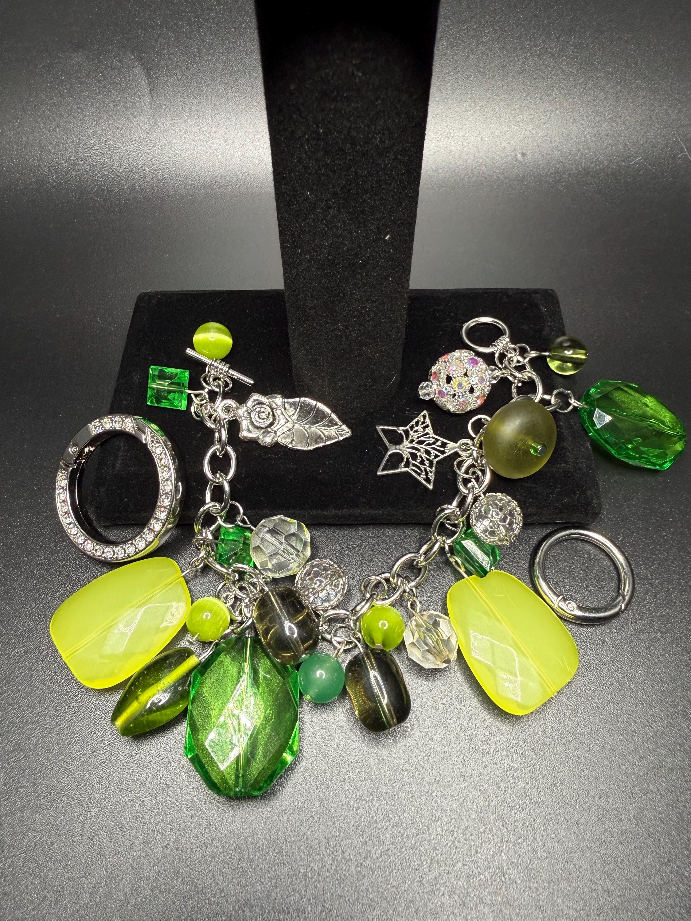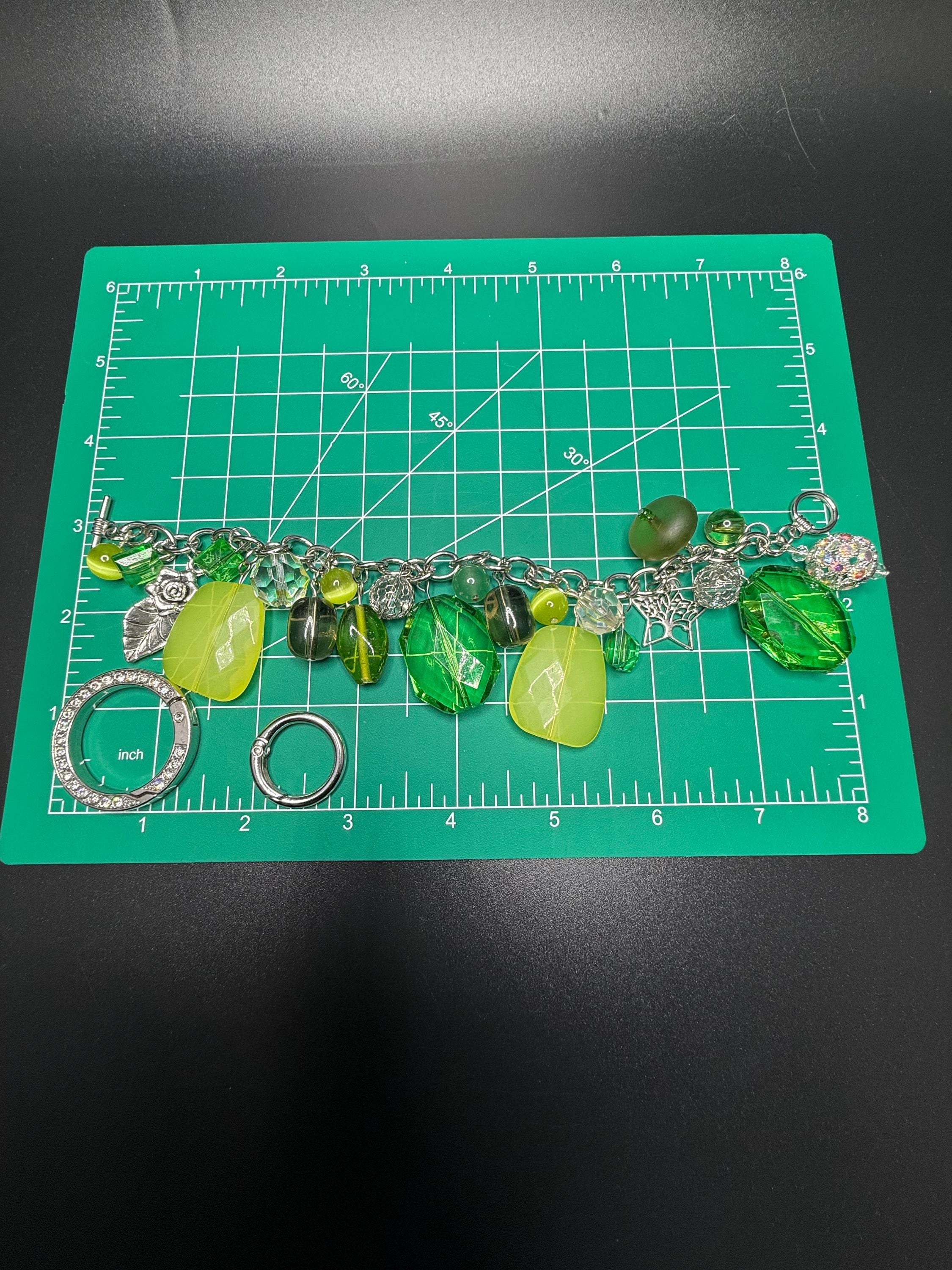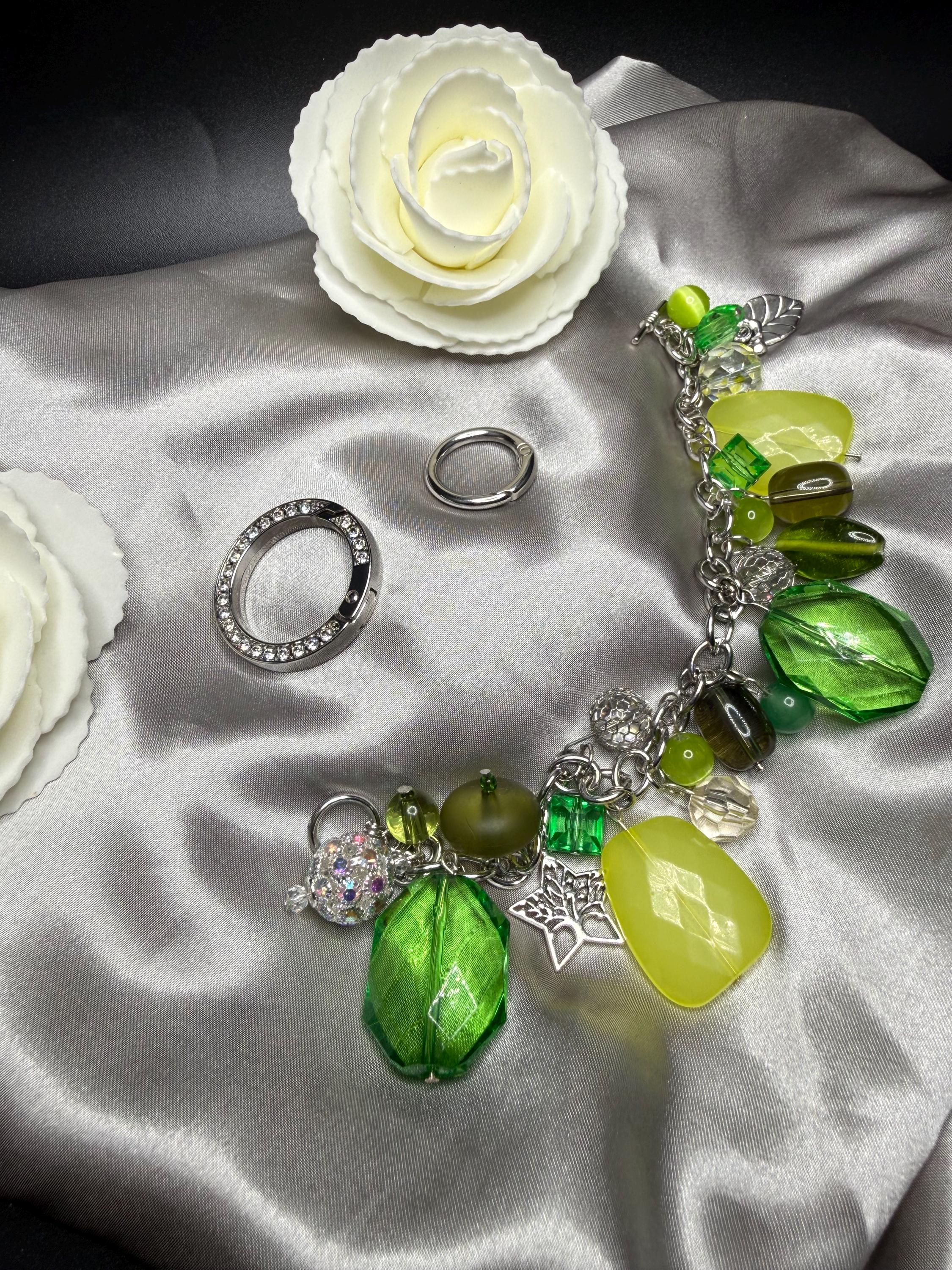Silver Charm and Green Beaded Purse Bracelet with Star and Leaf Charms and Bling “O” ring