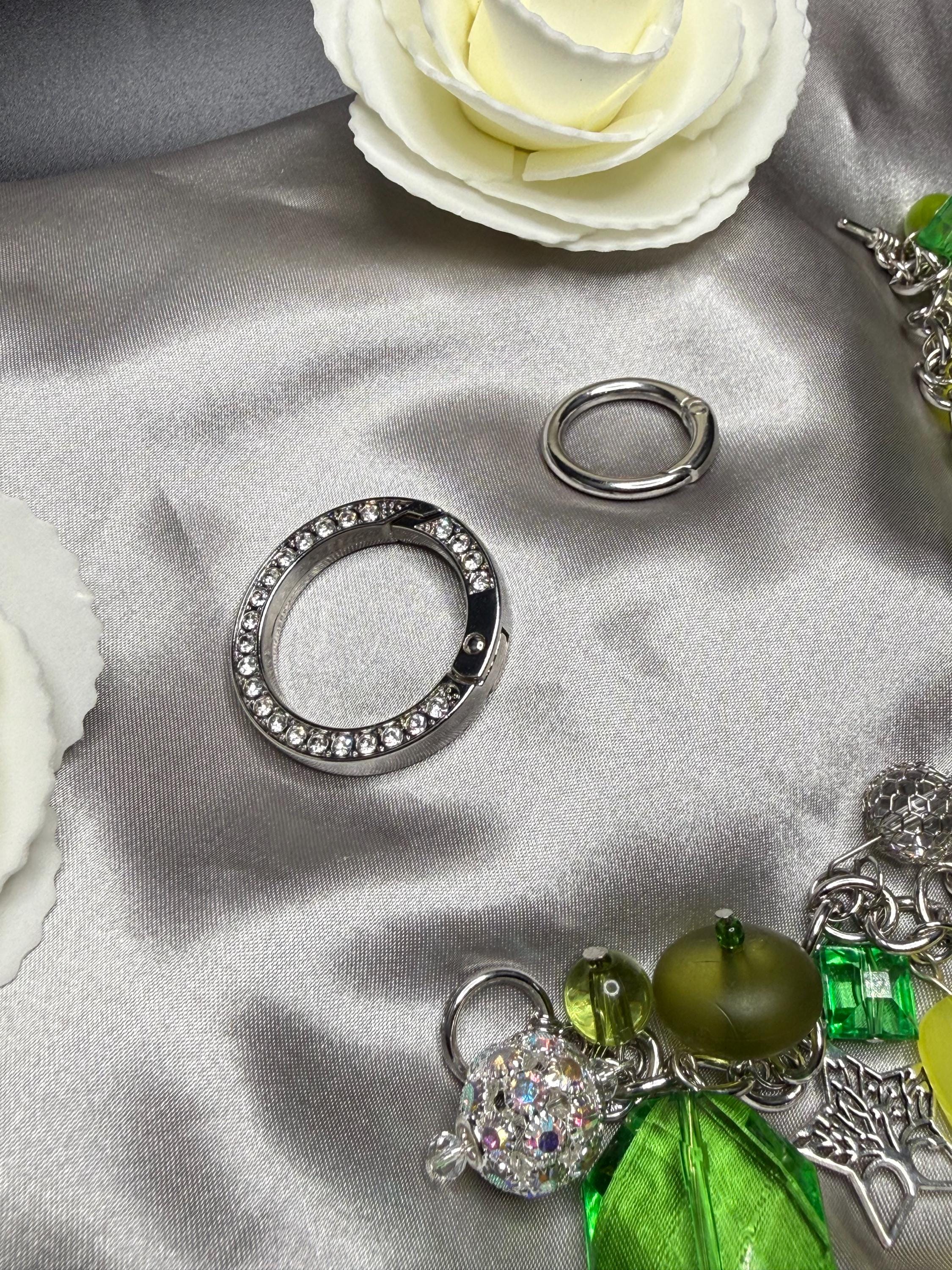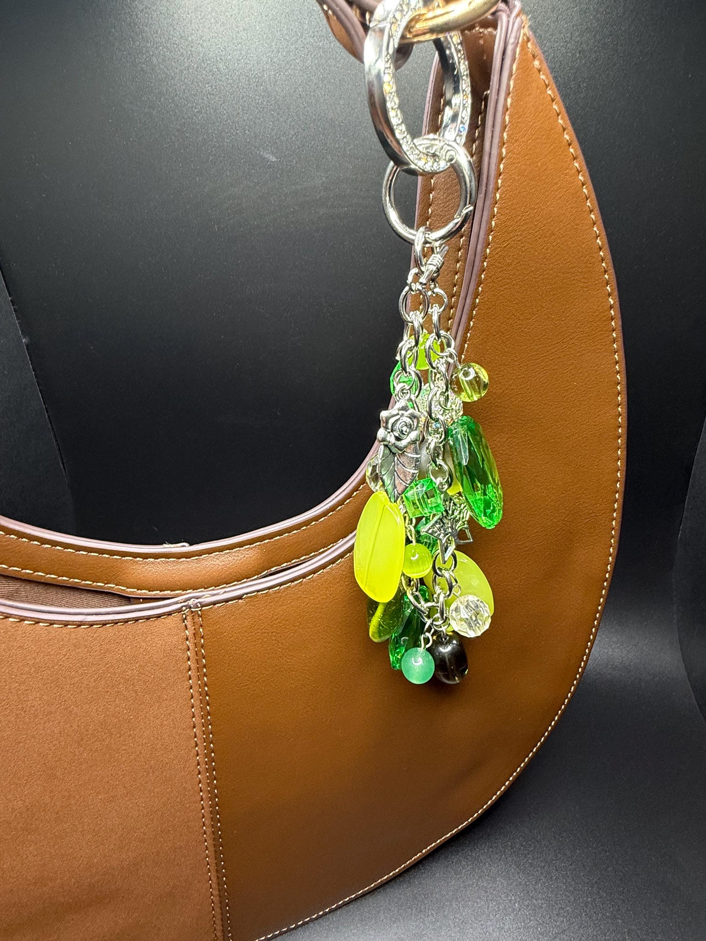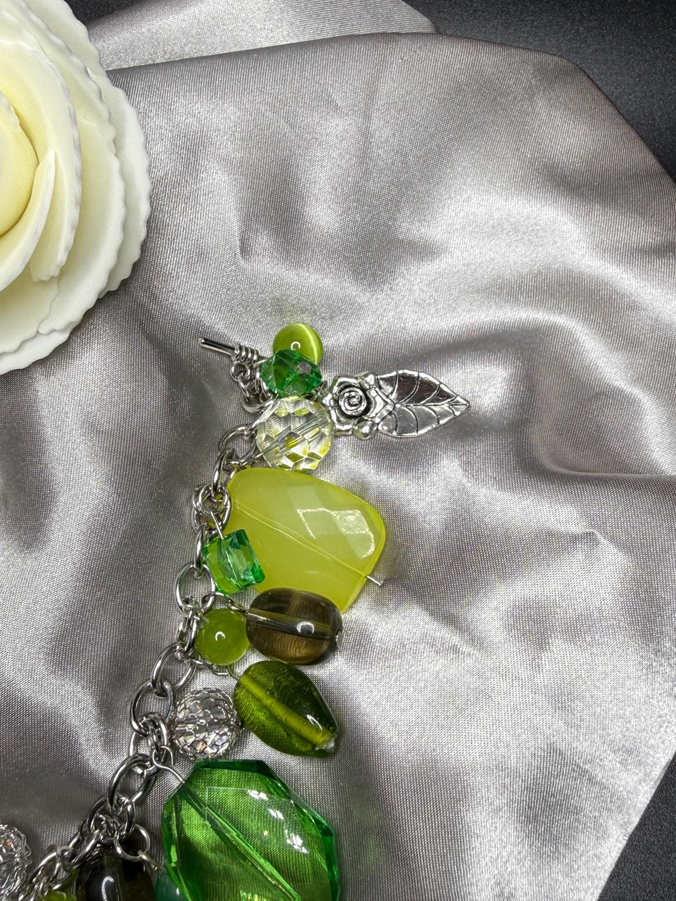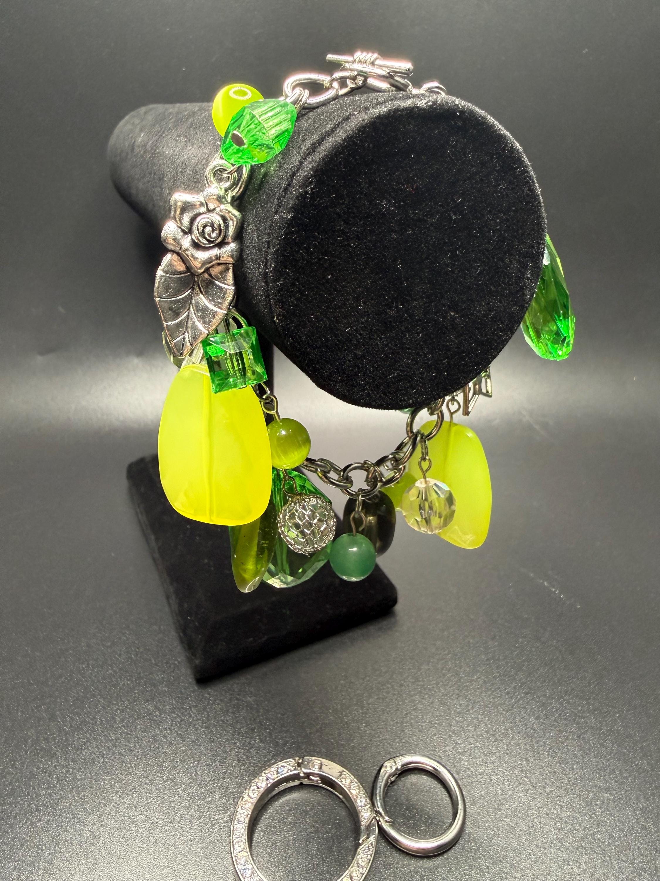 Silver Charm and Green Beaded Purse Bracelet with Star and Leaf Charms and Bling “O” ring