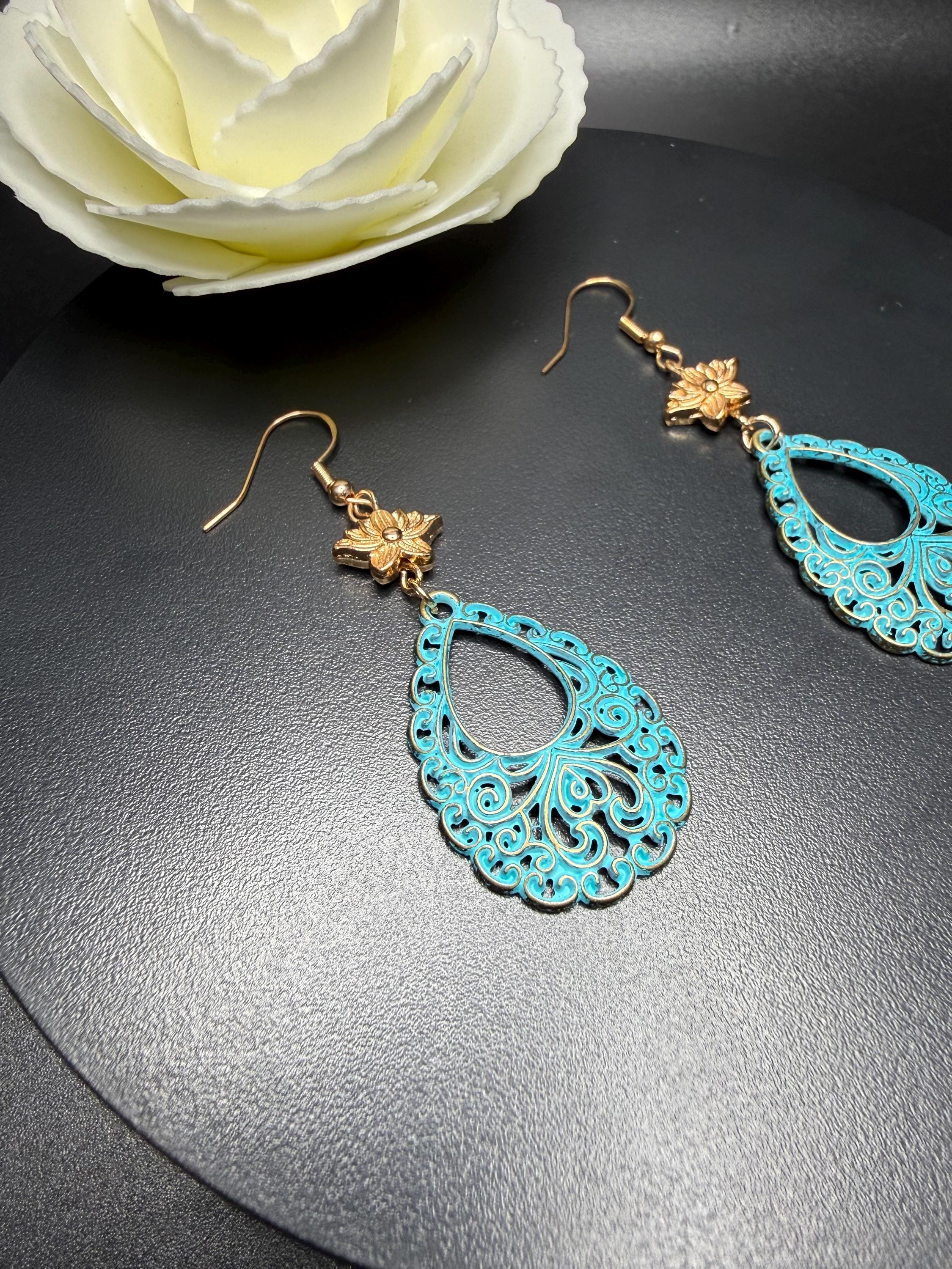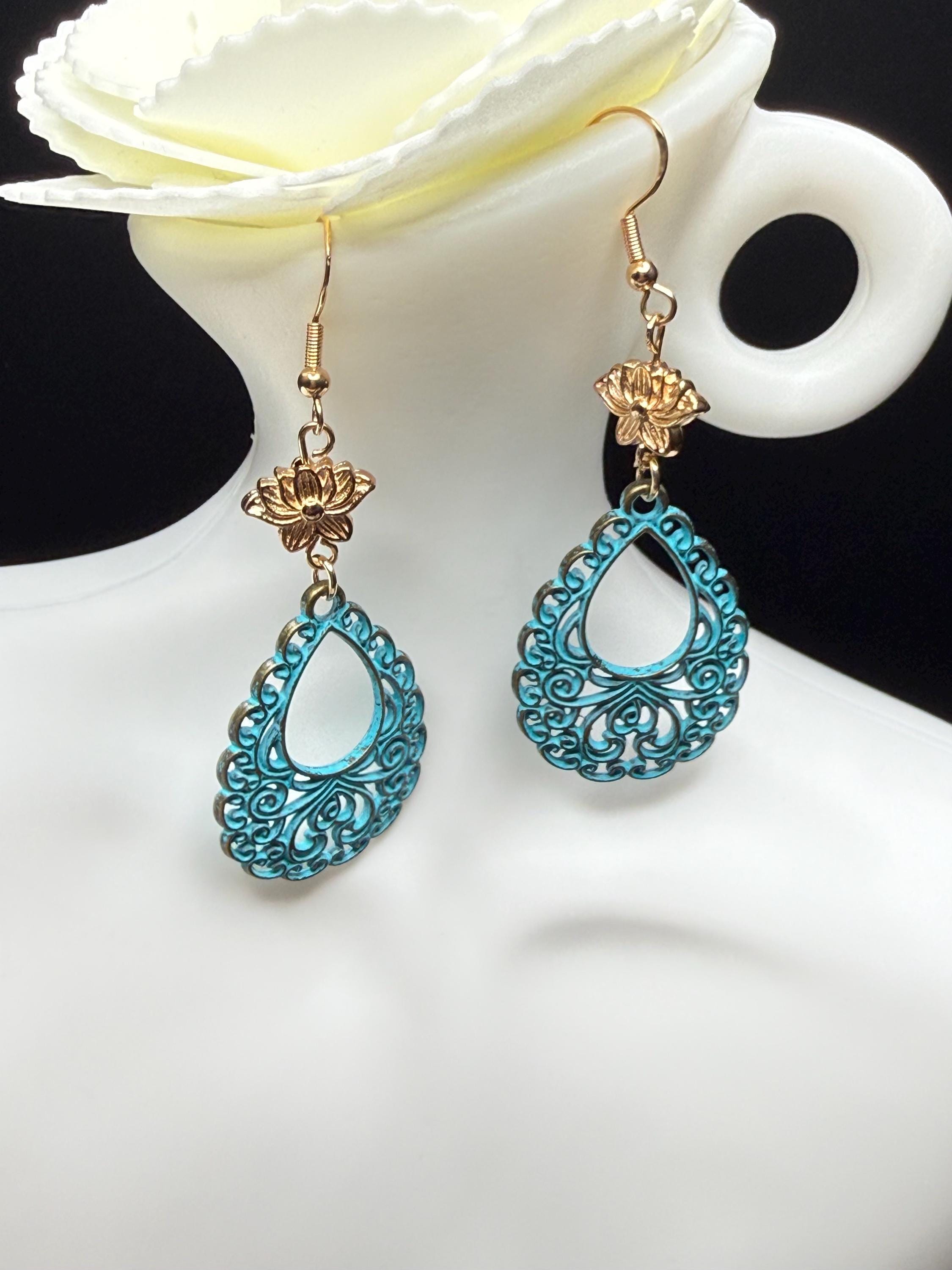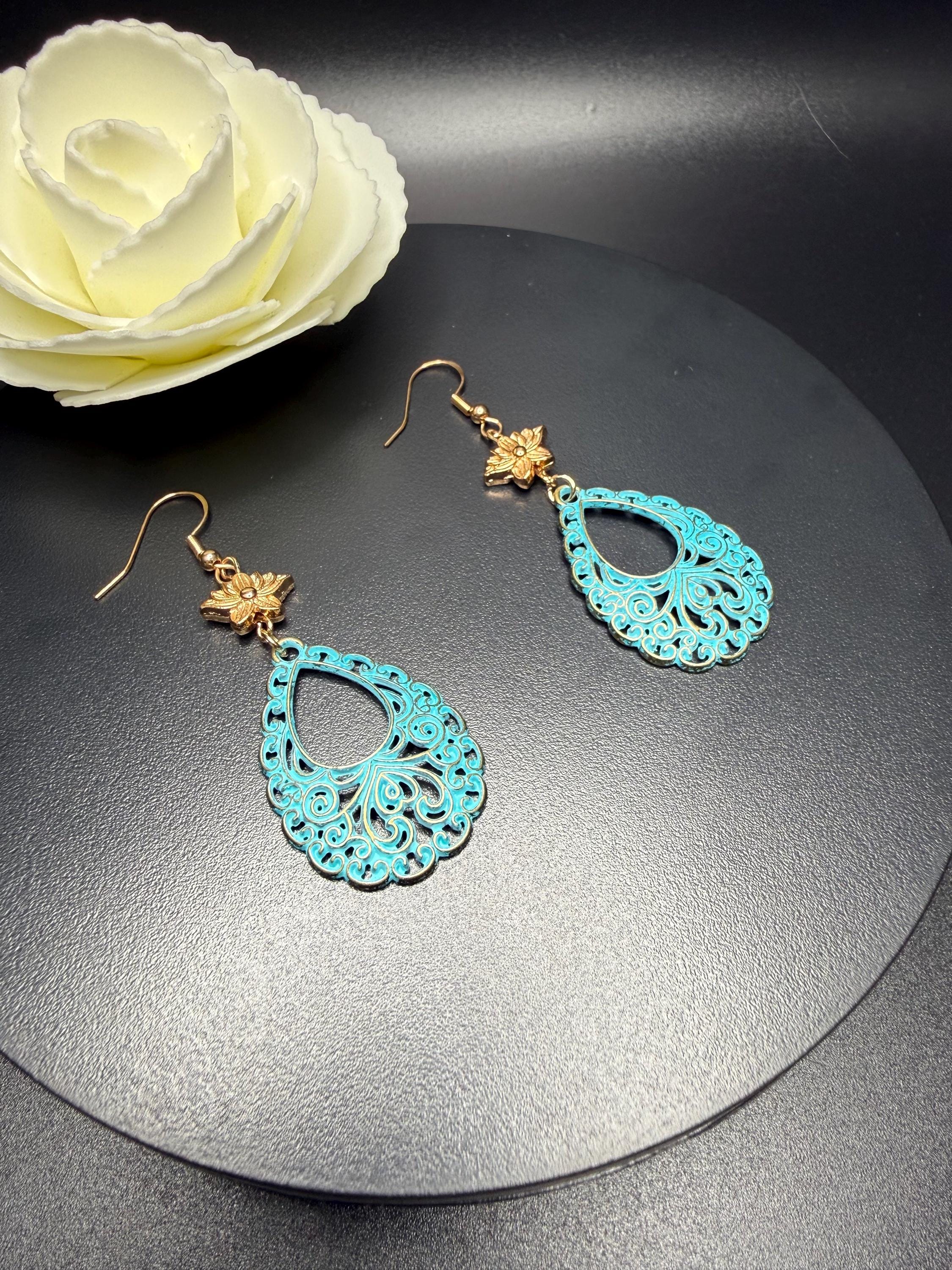 Antique Gold Flower and Lace Patina Hoop Earrings